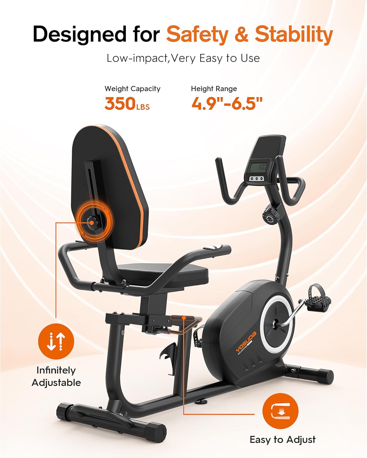 • 【BUILT TO LAST】Constructed of commercial-quality steel, our recumbent exercise bike supports up to 350lbs and ensures a safe and stable workout. Furthermore, the infinitely adjustable seat accommodates riders from 4'9'' to 6'2'', perfect for any home gym.