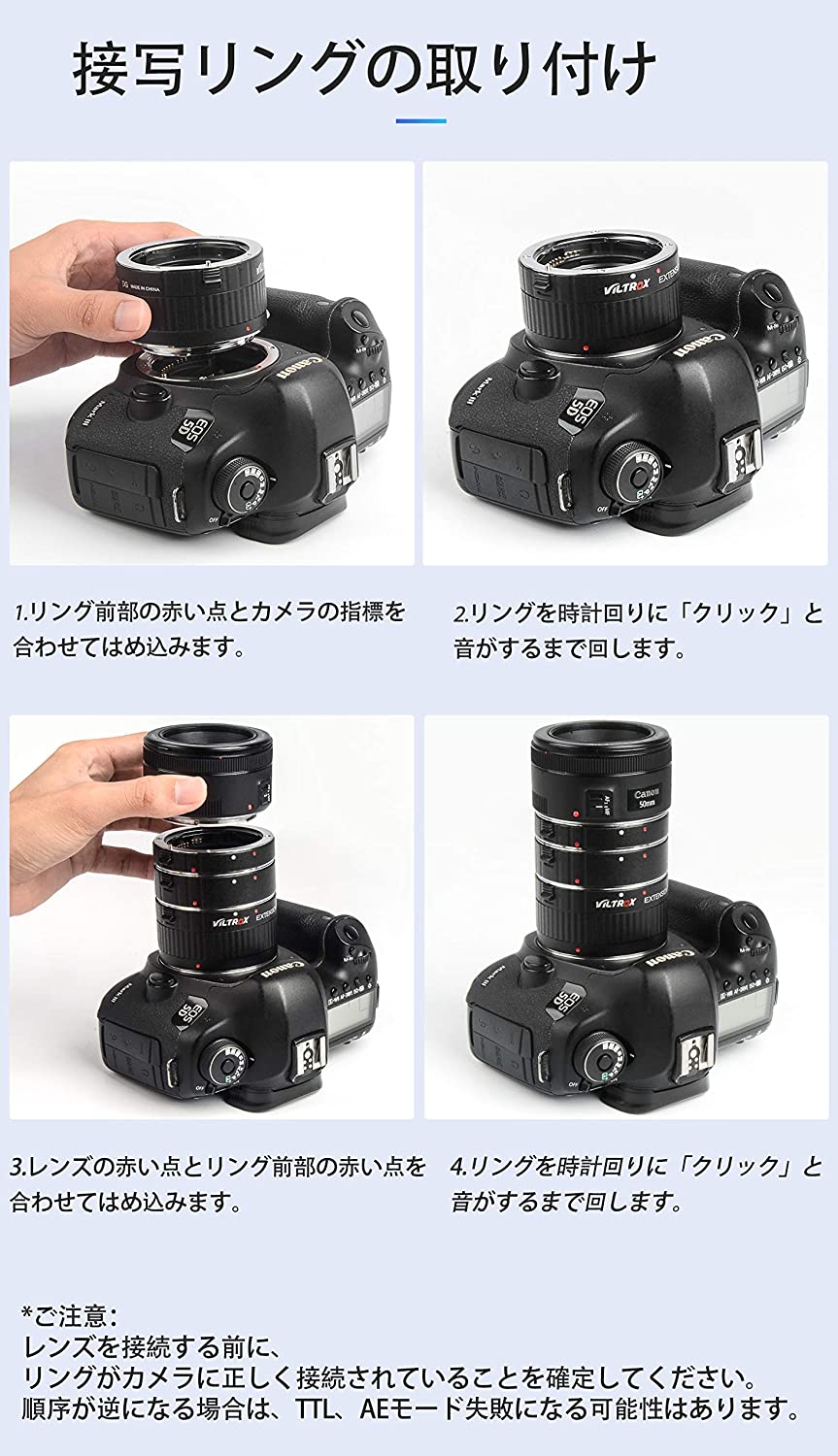 • We don't recommended to combine 2 or 3 rings at same time if the focal length is less than 70mm.the auto focus is easy when mount ONE ring , but difficult for 2 or 3 . we suggest to set your camera in MF .