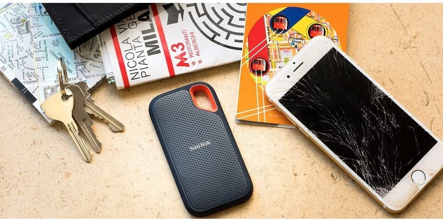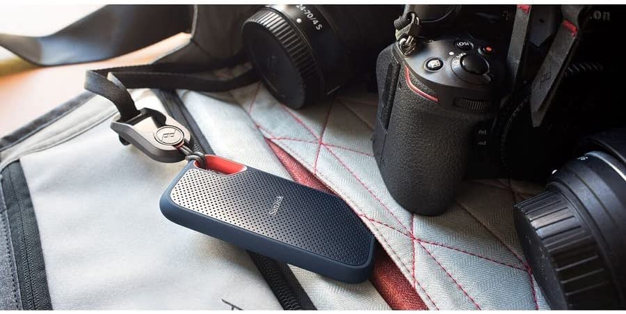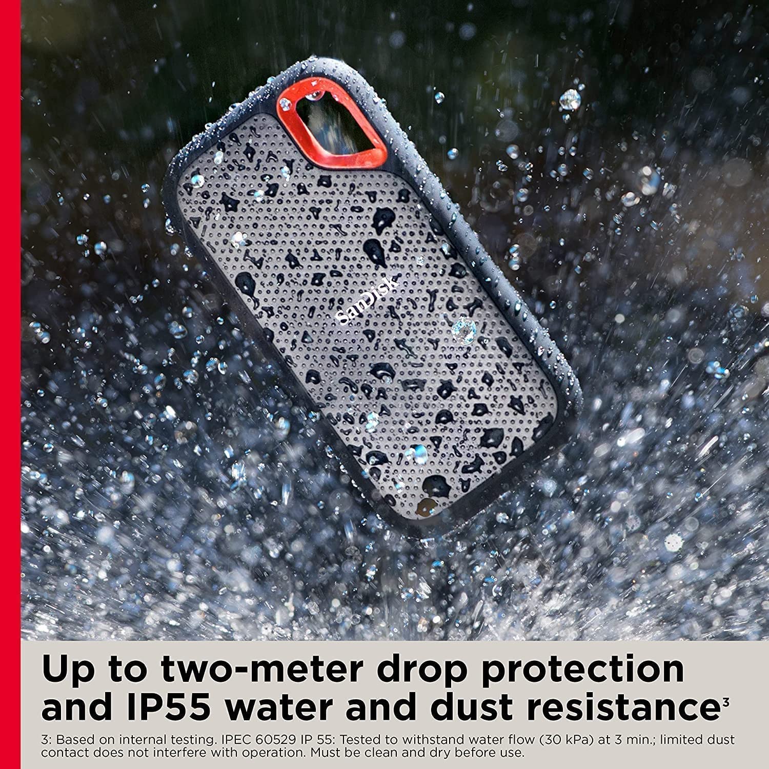 Your life’s an adventure. To capture and keep its best moments, you need fast, high-capacity storage that accelerates every move. 1050MB/s read and 1000MB/s write speeds let you store your content and creations on a fast drive that fits seamlessly into your active lifestyle. Up to two-meter drop protection (3), with IP55 water and dust resistance (3), a carabiner loop for securing the drive. From the brand trusted by professional photographers, the SanDisk Extreme Portable SSD provides fast solid state performance in a tough, reliable storage solution. 1GB = 1,000,000,000 bytes, 1TB = 1,000,000,000,000 bytes. Actual user capacity less. Up to 1050MB/s read speed, up to 1000MB/s write speed. Engineered with proprietary technology to reach speeds beyond UHS-I 104MB/s, requires compatible devices capable of reaching such speed. Based on internal testing; performance may be lower depending on host device, interface, usage conditions and other factors. 1MB=1,000,000 bytes. (1) See official SanDisk website. (2) Password protection uses 256-bit AES encryption and is supported by Windows 8, Windows 10 and macOS v10.9+ (Software download required for Mac, see official SanDisk website.) (3) Based on internal testing. IPEC 60529 IP 55: Tested to withstand water flow (30 kPa) at 3 min.; limited dust contact does not interfere with the operation. Must be clean and dry before use.