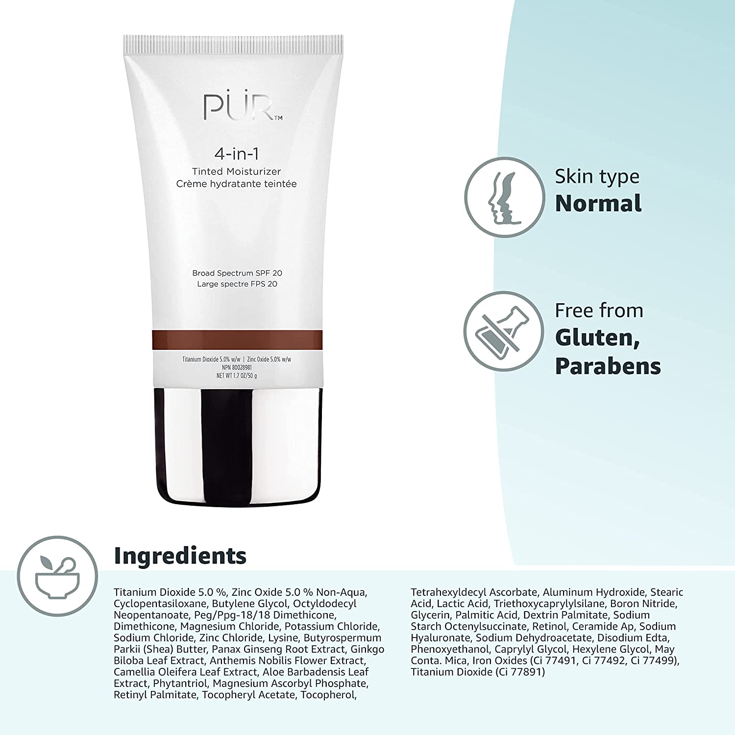 PÜR 4-in-1 Tinted Moisturizer With SPF 20 - Hydrating Face Moisturizer, Primer, & Foundation With Shea Butter, Aloe Vera & Vitamin B3 - Vegan Friendly - Free of Paraben, Gluten & BPA