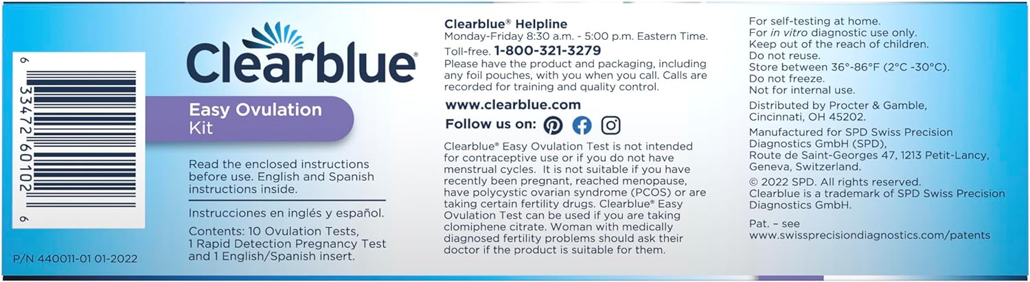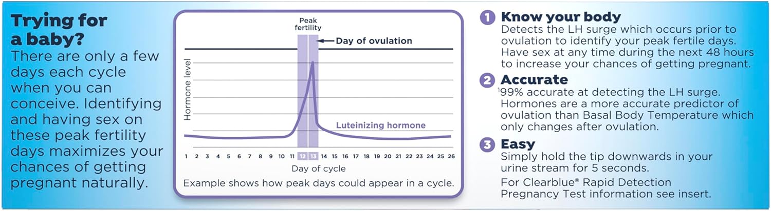 The Clearblue Easy Ovulation Test (prueba de ovulacion Clearblue Easy) identifies your 2 most fertile days and is 99% accurate at detecting the luteinizing hormone (LH) surge. It is easy to use and once you think you might be pregnant, use the Clearblue Rapid Detection Pregnancy Test for fast and accurate results.(1) Data on file (2) Rapid Detection: Over 99% accurate from the day of expected period. >99% accurate at detecting typical pregnancy hormone levels. Note that hormone levels vary. See insert.