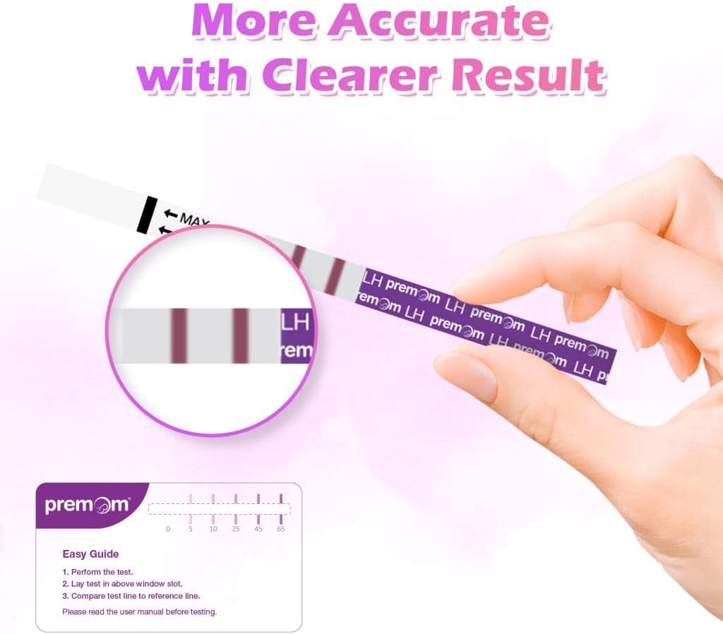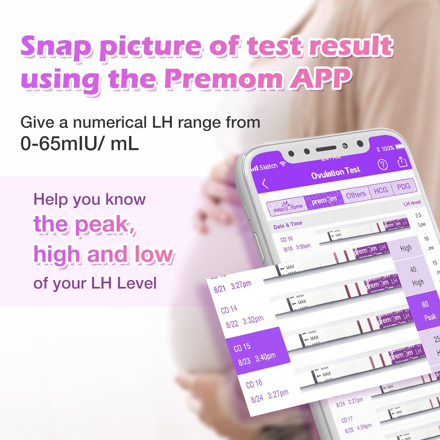 • Quantitative & Digtal Ovulation Test: With smart Premom APP or color chart, this OPK quantifies your LH Level from 2.5 to 65 mIU/mL and shows your exact LH results in a complete chart of your ovulation cycle, particularly beneficial for women with PCOS, irregular cycles, ​multiple surges, or hard-to-recognize surges.