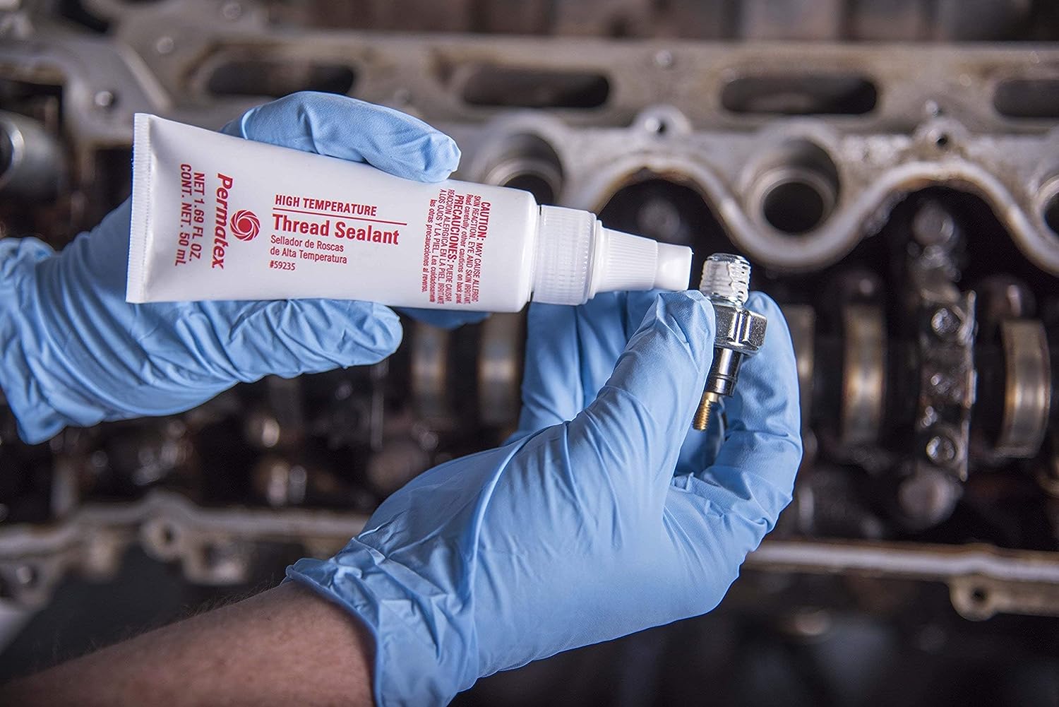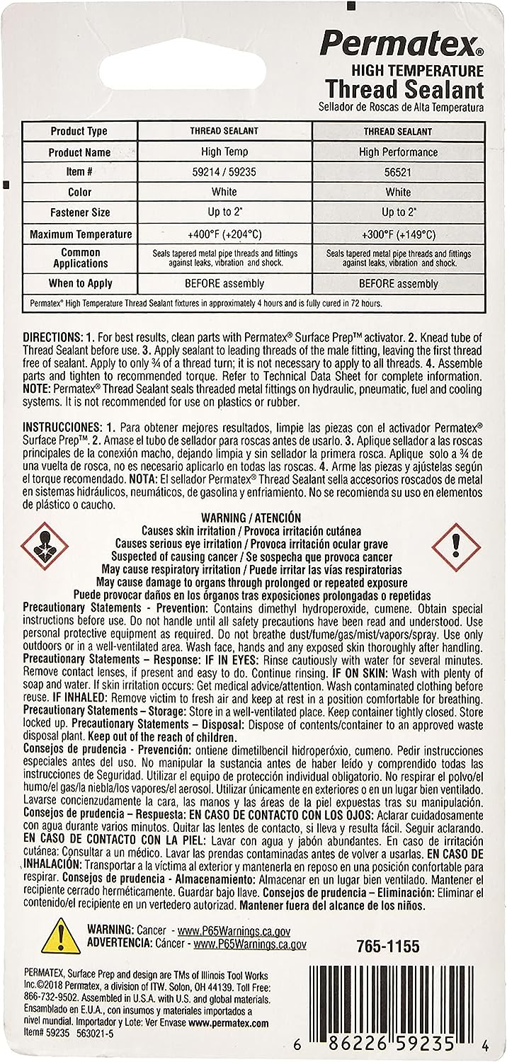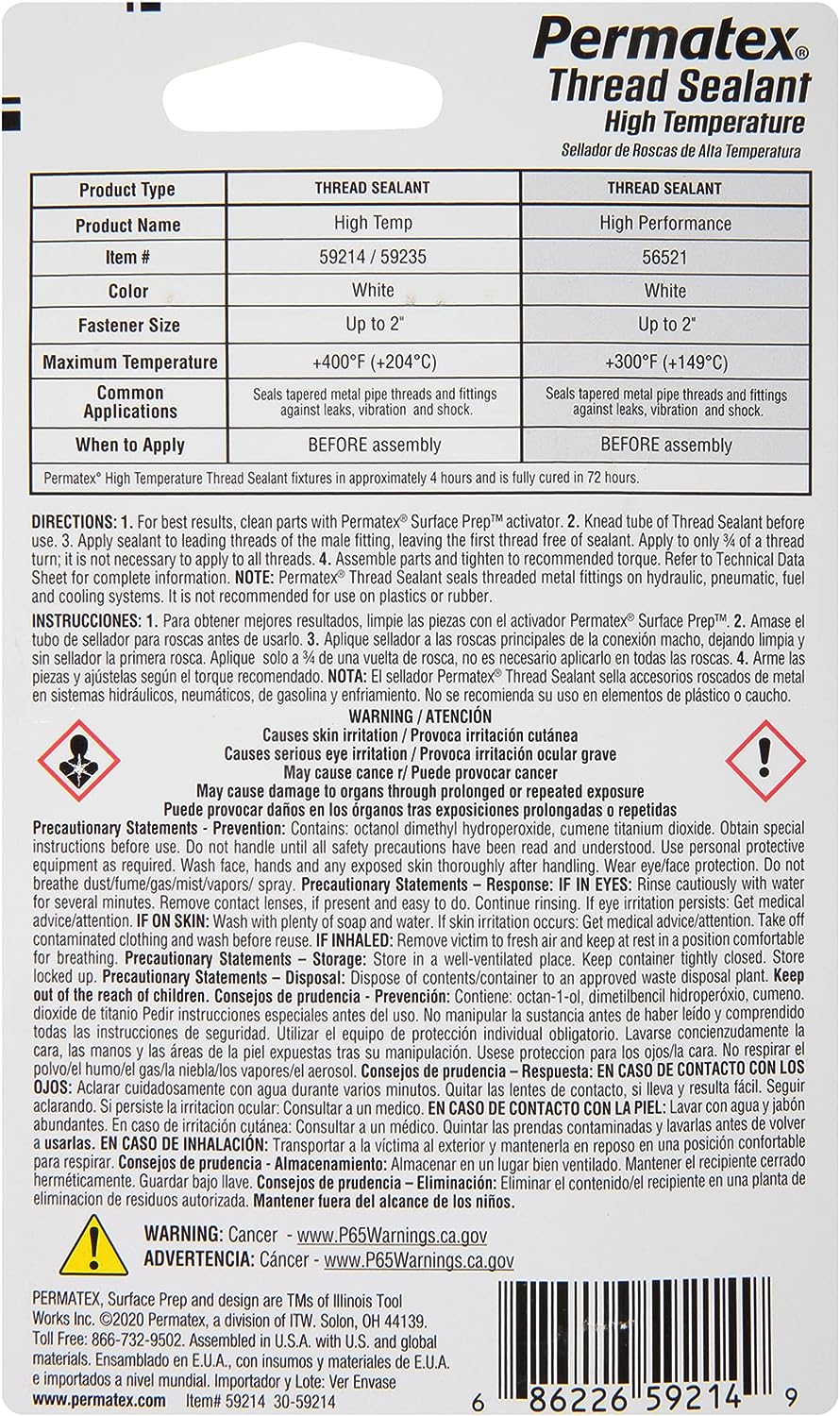 Permatex High Temperature Thread Sealant lubricates threads for easy assembly and disassembly and locks and seals threaded fittings. Resists leakage, vibration loosening, moisture, hydraulic fluids and diesel fuels and won’t shred or wear like other tape. Parts may be repositioned up to 4 hours after application. Temperature range from -65 degrees fahrenheit to 400 degrees fahrenheit.