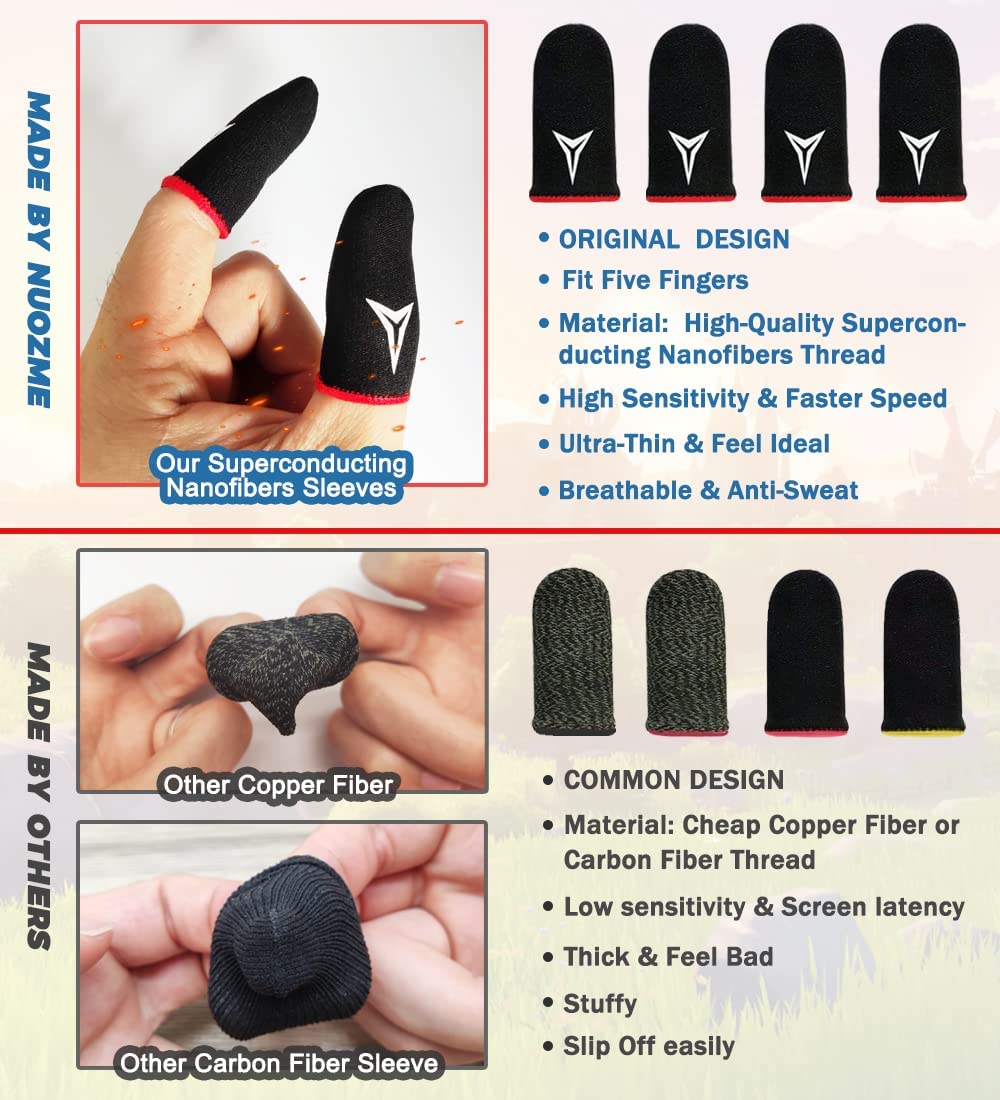 • 【High Sensitivity】High-Quality superconducting 24-needle nanofiber threads are used to improve sensitivity including covering fingertips, finger abdomen ,finger sides. Compared with other cheap copper fiber, carbon fiber,or traditional 18-needle fiber sleeve, touch sensitivity of Nuozme sleeves are far improved. Finger slides pretty smooth on the screen while wearing them and screen latency is greatly reduced than bare hands.