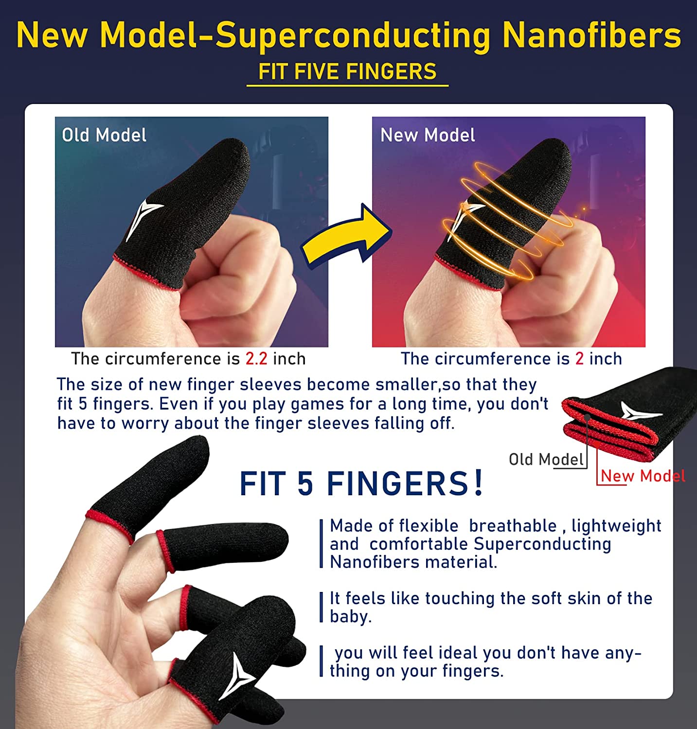 • 【High-Quality Material &Comfortable To Wear】Made of flexible, breathable , lightweight and comfortable Superconducting Nanofibers material, it feels like touching the soft skin of the baby, and you will feel ideal you don't have anything on your fingers while wearing it. The size of the new model finger sleeve become smaller. The circumference of the sleeve is changed from 2.2 inches to 2 inches, so that it fit 5 fingers and you won't have to worry about the sleeve falling off.