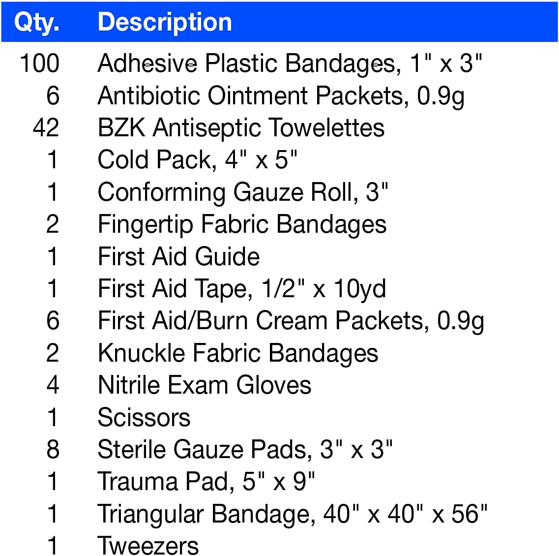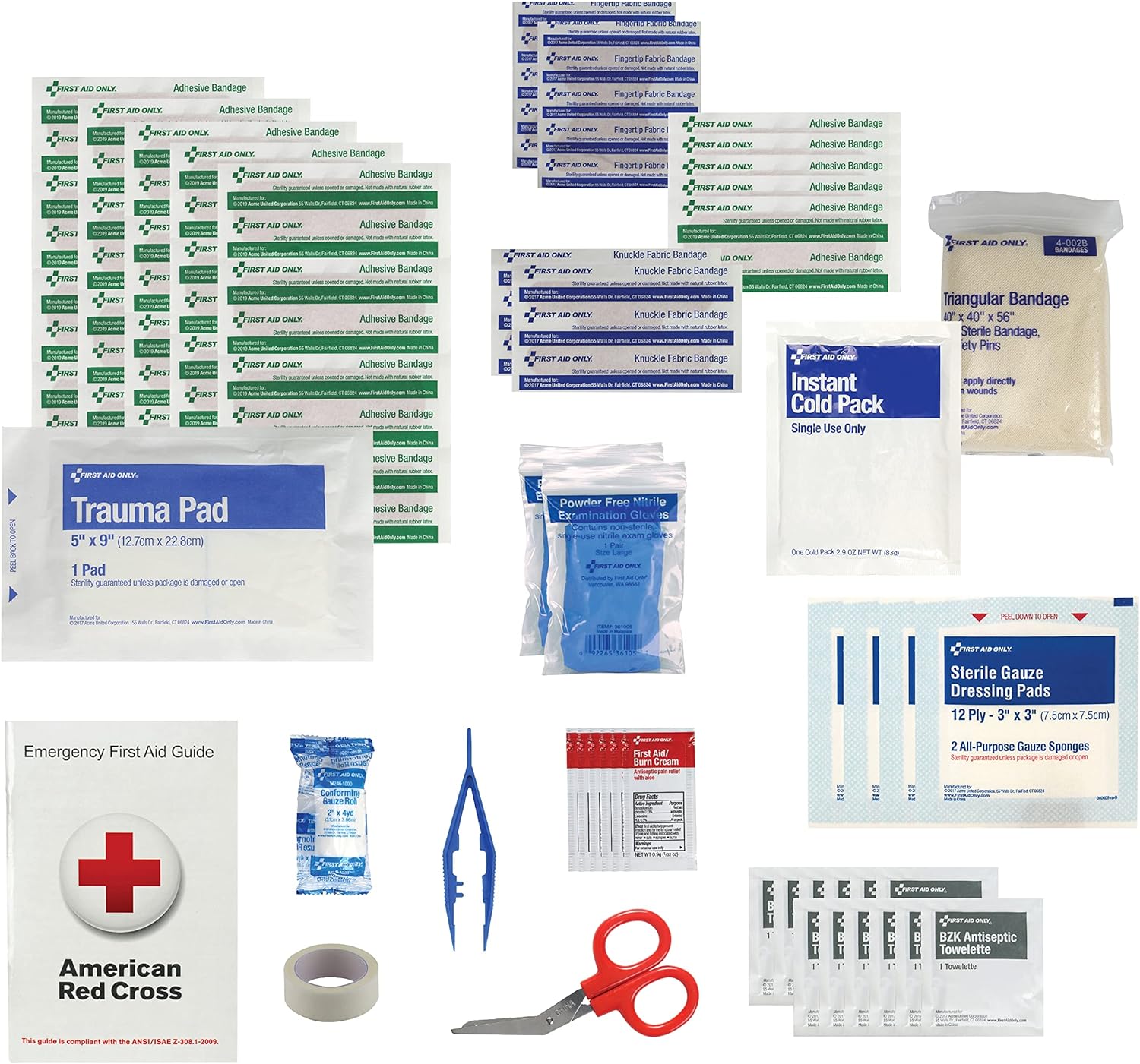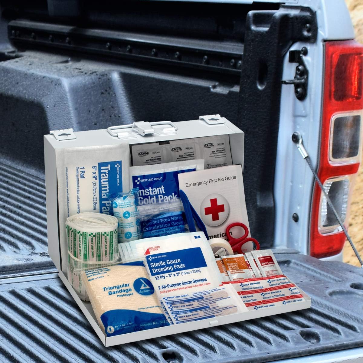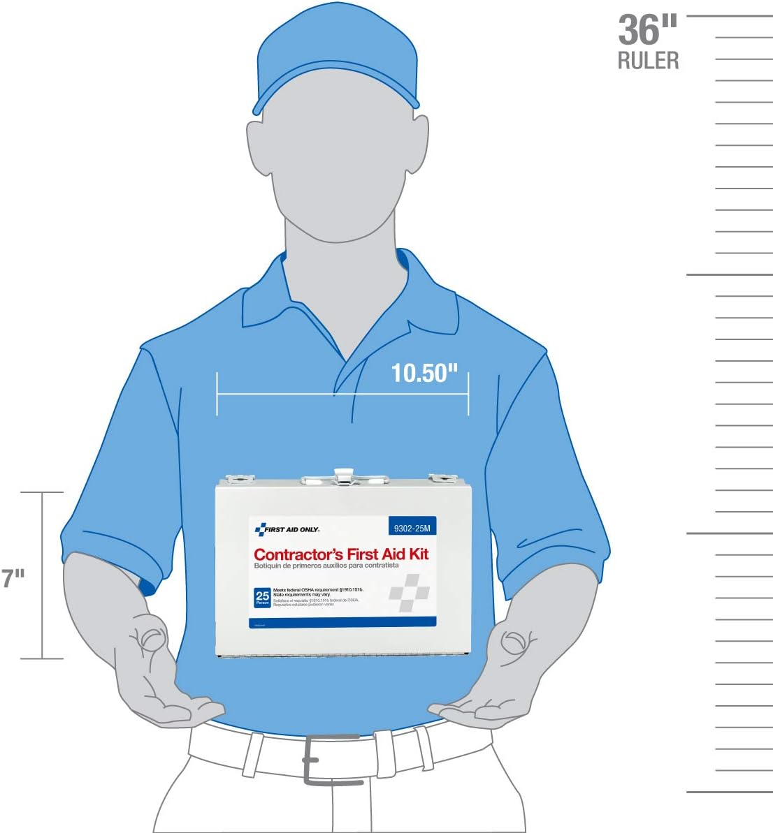 First Aid Only's 25-person Contractor's First Aid Kit prepares you for tackling minor emergencies on a jobsite. This 178-piece first aid kit has supplies for treating pain and swelling, as well as cuts, scrapes, and wounds. It comes in an easy-to-carry metal case with an easy-to-release latch designed to ensure quick first aid access in the event of an emergency. Our first aid kits for businesses, home renovation projects, and construction vehicles allow you to treat minor cuts and scrapes just about anywhere.