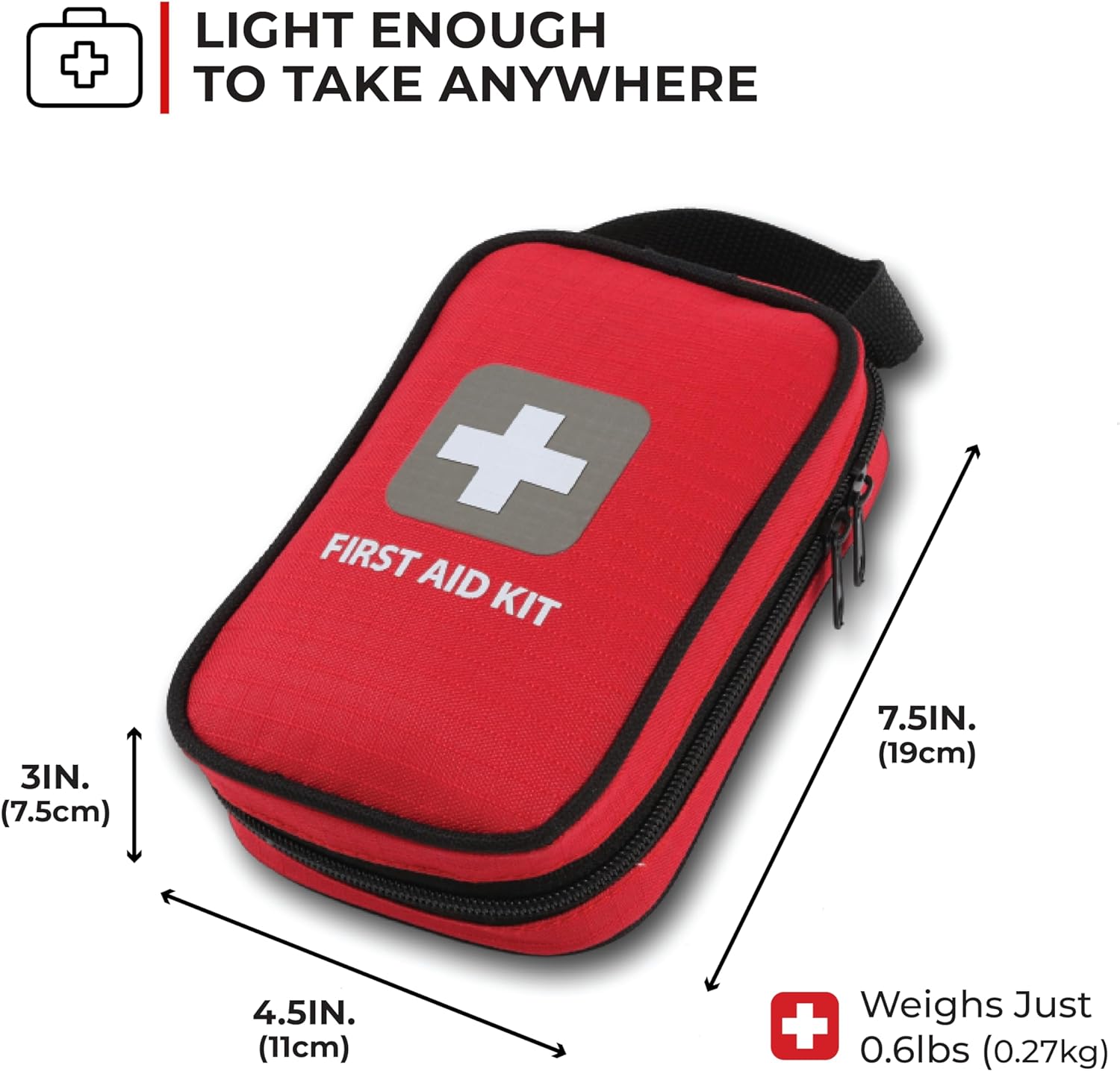 • Everything in One Bag: The travel essentials are crafted from durable rip-stop nylon and vinyl fabric. These medical Supplies are lightweight, Compact and yet still holds Everything you need for life’s unexpected events. Extensive inner pockets keep the contents stored neatly between uses. Reflective and Red Cross logo for added. This first aid medical kit is 5 inches long X 3.75 inches wide X 1.5 inches thick. It weighs approximately 0.3 lbs