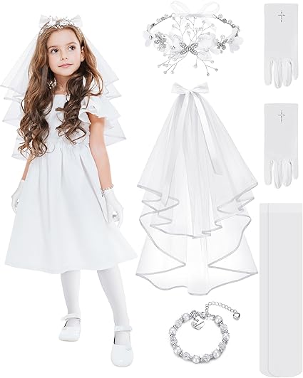5 Pcs First Communion Girl Accessories First Communion Veils Headpiece with Comb Charm Bracelet Rhinestone Pearl Hair Headband Cross Gloves and Socks for Girls Catholic First Communion Jewelry Set