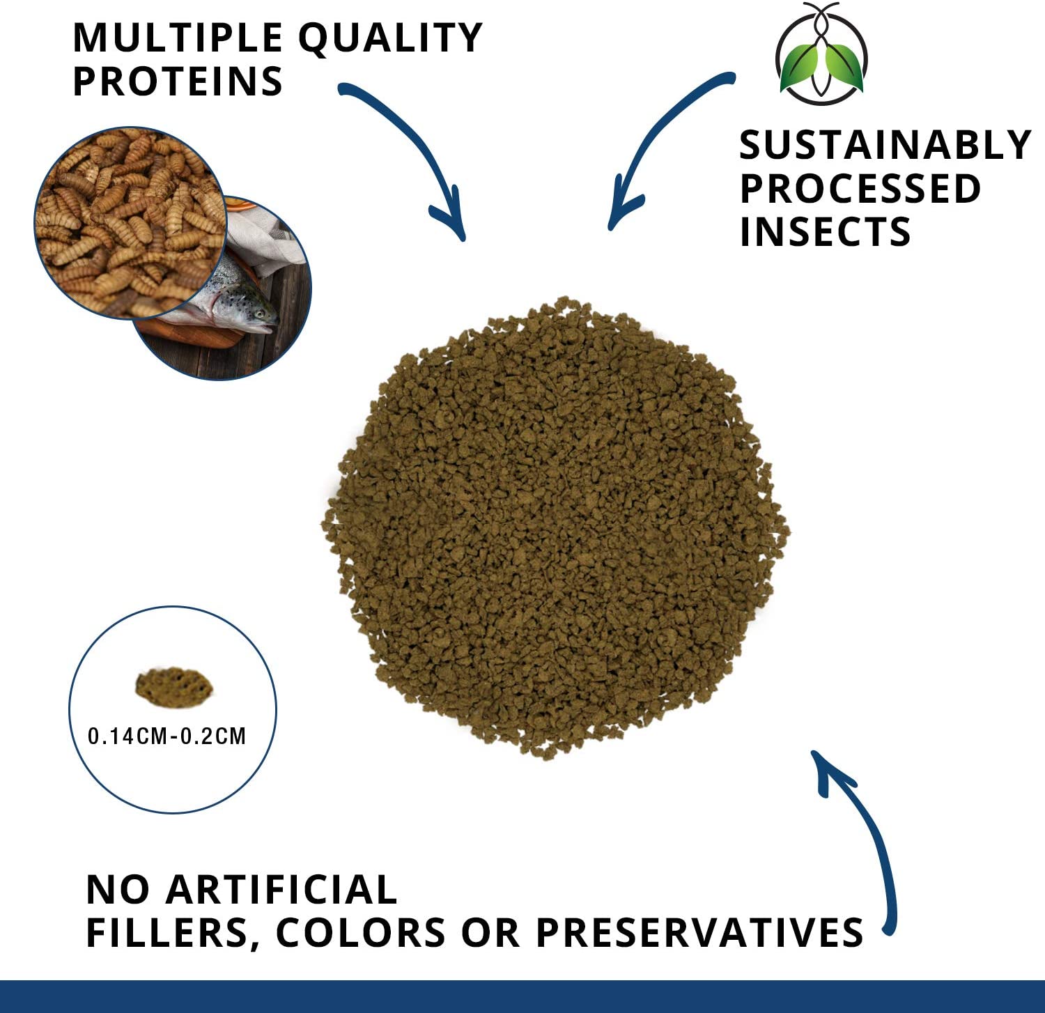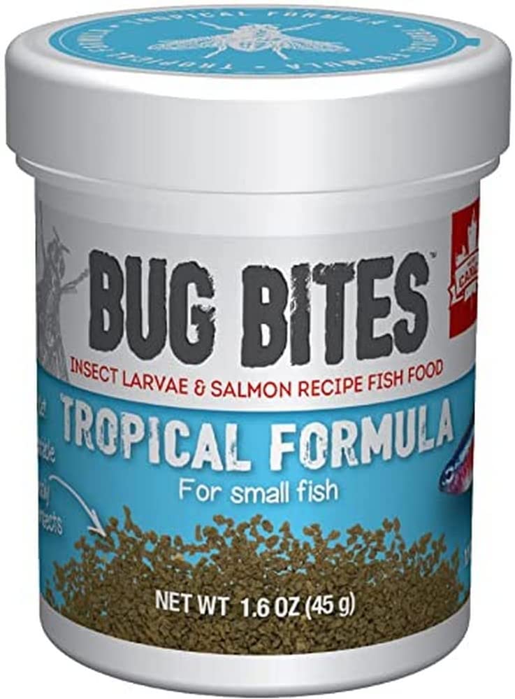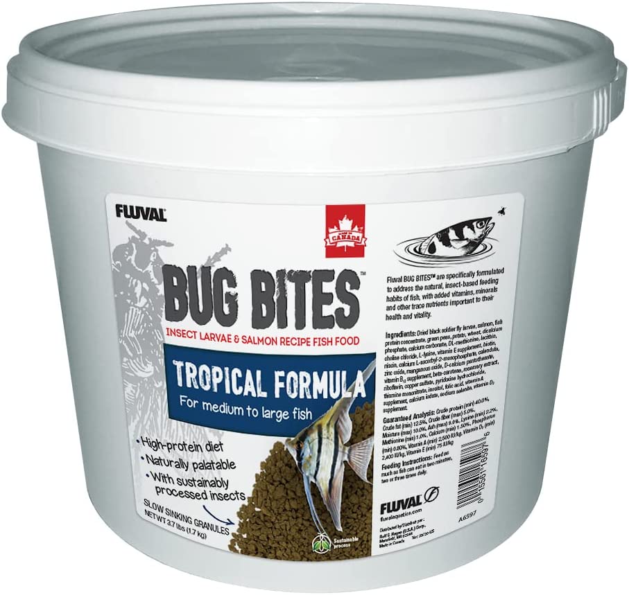 Fluval Bug Bites is a complete fish food that features a unique insect-based formulation, enriched with multiple quality proteins and carbohydrates that are ideal for tropical fish such as bettas, goldfish, cichlids, guppies, and tetras. Insects are hunted by fish in the wild as they offer a widely available food source. The instinctive feeding habit is the foundation behind Bug Bites, which are formulated with nutrient-rich insect larvae and enriched with multiple quality proteins, vitamins, minerals and trace elements. Most freshwater fish are omnivores and regularly feed on insects in the wild. However, not all insects are created equally when it comes to a fish’s diet. Bug Bites are formulated with sustainably harvested Black Soldier Fly Larvae (#1 ingredient across all formulas), which are raised on fruits and vegetables for exceptional “super food” nutrition. Using a unique cultivation process, BSFL are grown under controlled conditions for total sustainability that preserves natural environments. Under controlled conditions, Black Soldier Flies produce larvae, which naturally feed on decaying organic matter. Unconsumed fruits and vegetables are used as larvae feed. The larvae consume the feed, converting the nutrients into protein and healthy fat. After a 2-week feeding cycle, the larvae are harvested and dried. The dried larvae are mixed with other high-quality proteins, vitamins, minerals and trace elements to offer a complete and balanced daily diet. In addition to BSFL, Bug Bites offer other excellent protein sources such as Herring & Shrimp Meal, which are also rich in Omega-3 for healthy skin, scales, fins and colors. Unlike big brand fish foods, Bug Bites are always prepared in small batches for superior control and quality assurance. The proximity of our ingredients (most of which are delivered right before production) also offers maximum freshness, which translates into better palatability.