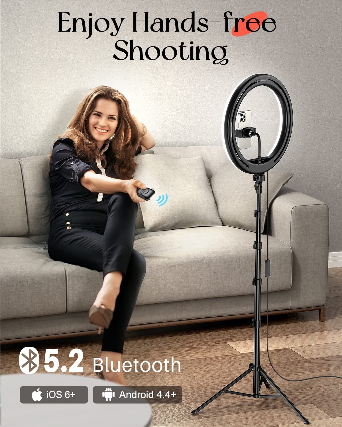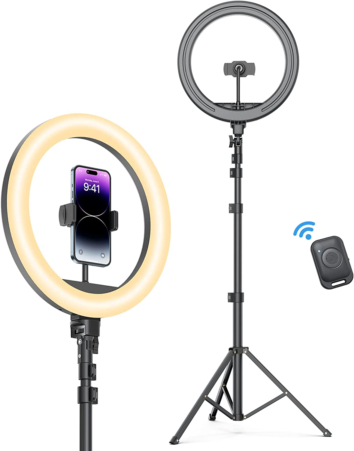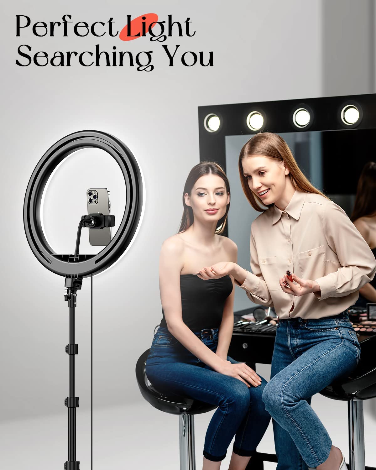 • 【Mega Power is Power】ANGFLY 13" ring light with stand and phone holder provide a ample lighting of your best looking self. The light-surround effect of a good light ring instantly reduces shadows in the face and minimizes blemishes, while illuminating the eyes. The ringlight space were sufficiently to compatible with large-screen mobile phones on the market like 6.7-inch iPhone 13 pro max, 6.8-inch Samsung Galaxy S21 Ultra.