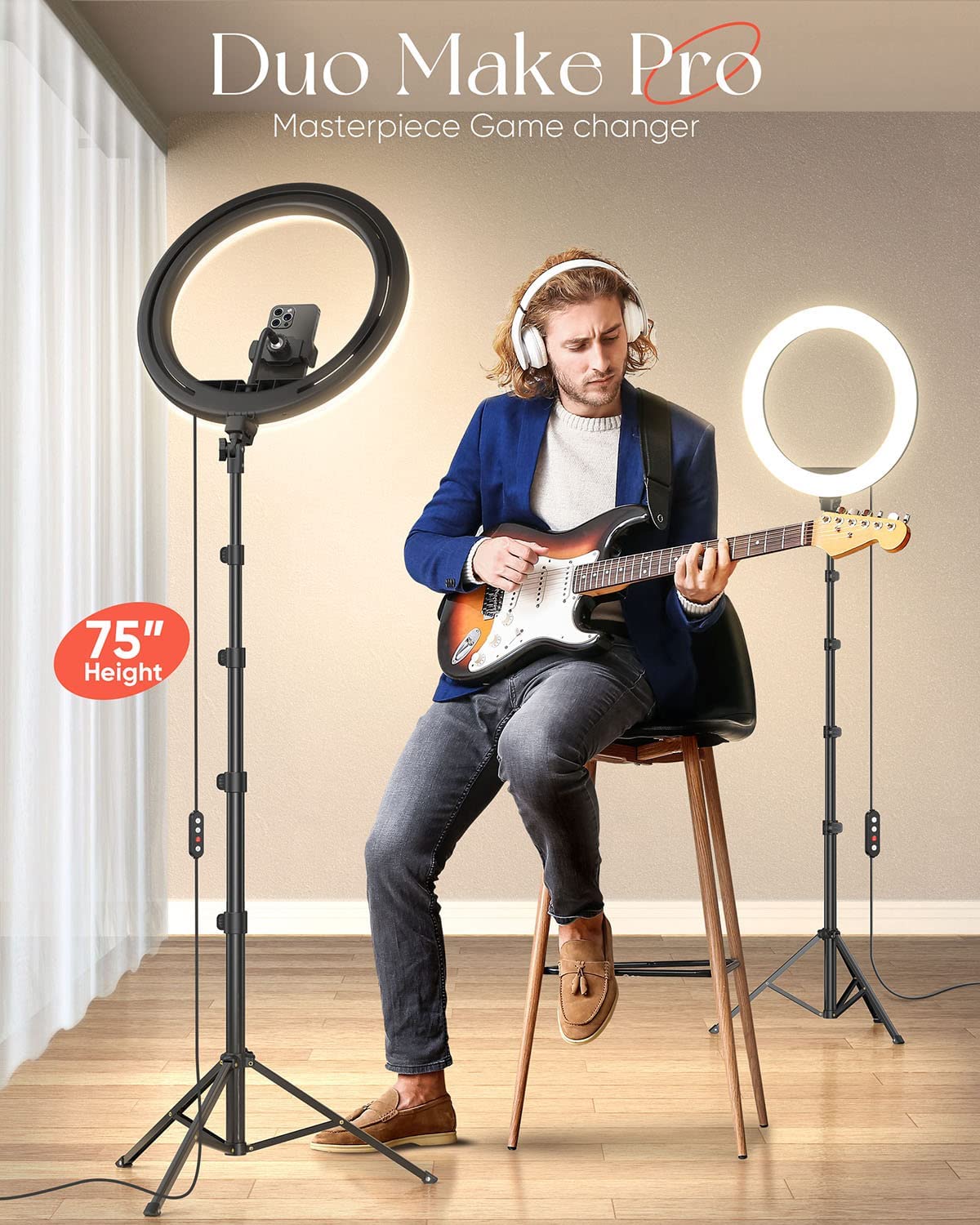 • 【Extends Up to 63 inch】Adjustable Large Ring light tripod extendable from 18 " to 63 ", plus the ringlight kit totally can reach 75 ", customized height meet a wide range of workspace and shooting needs, just set it at desired height for your preferred use, you can stand it on the floor for yoga live or stand on desk for zoom meeting.