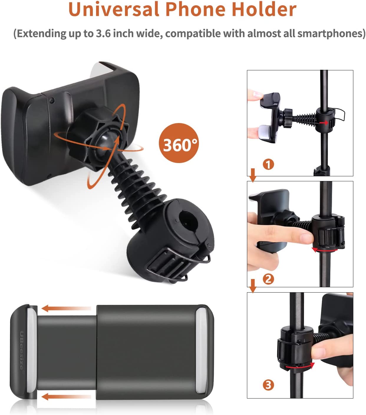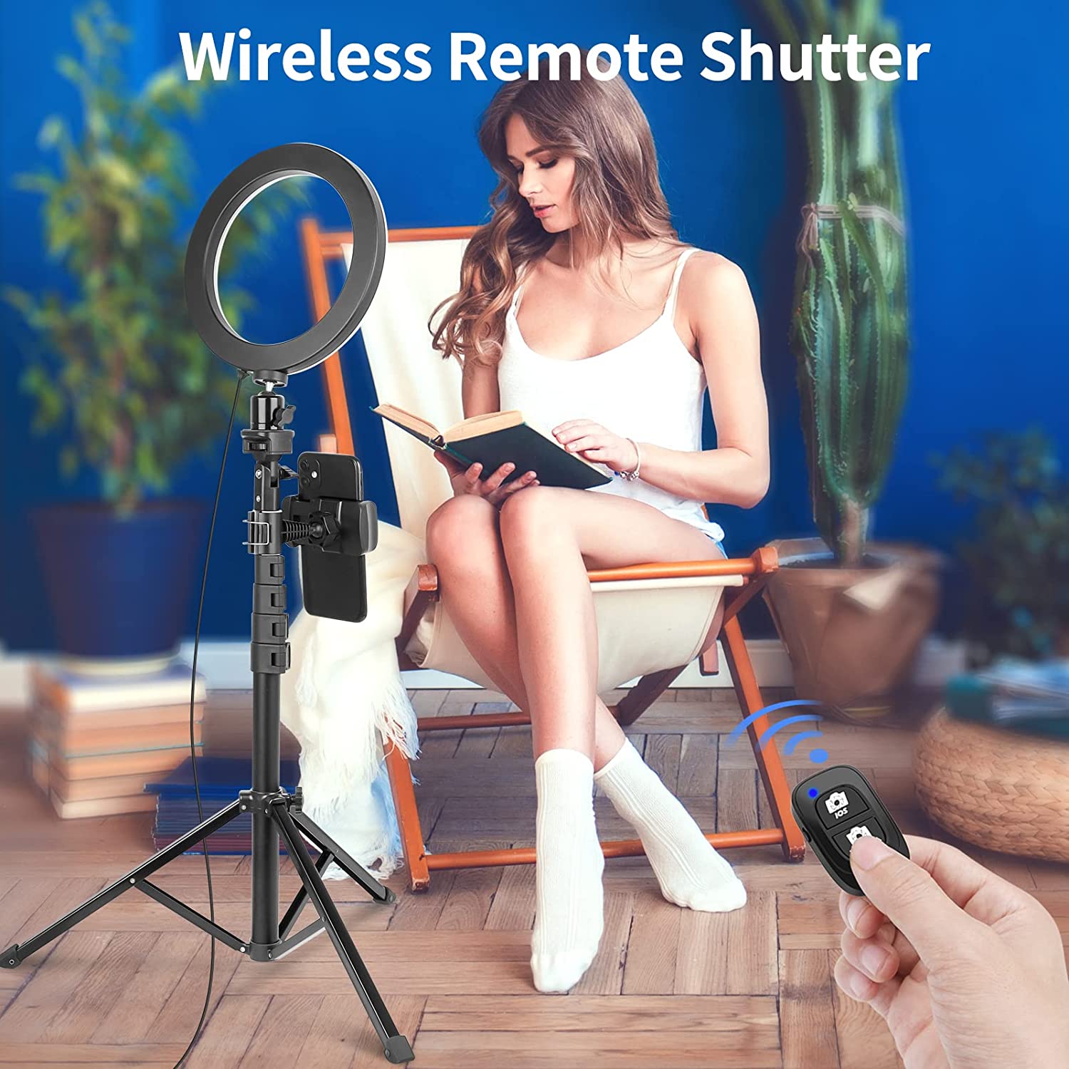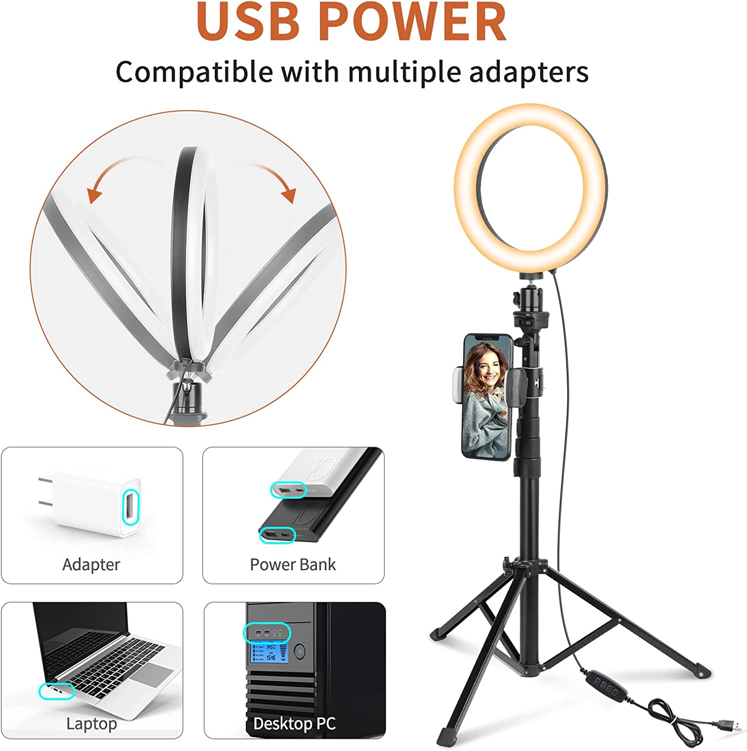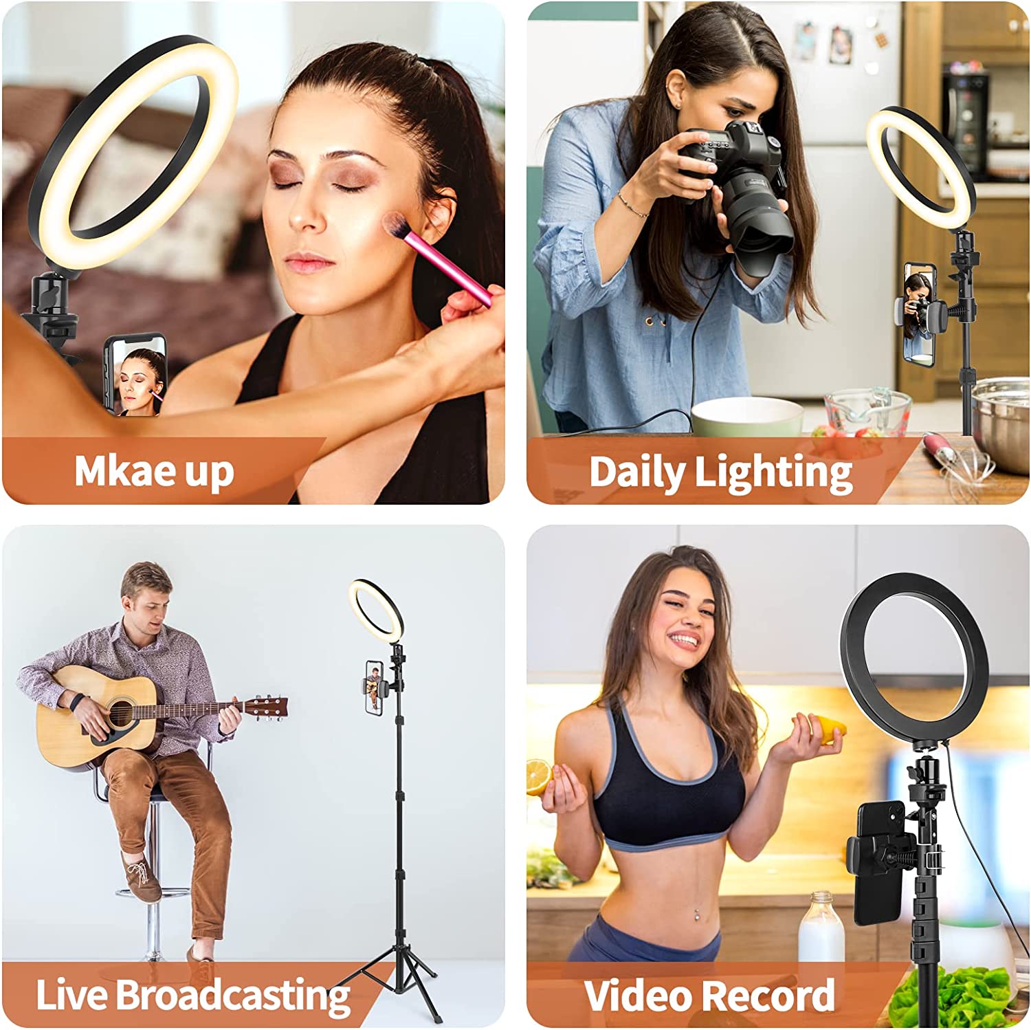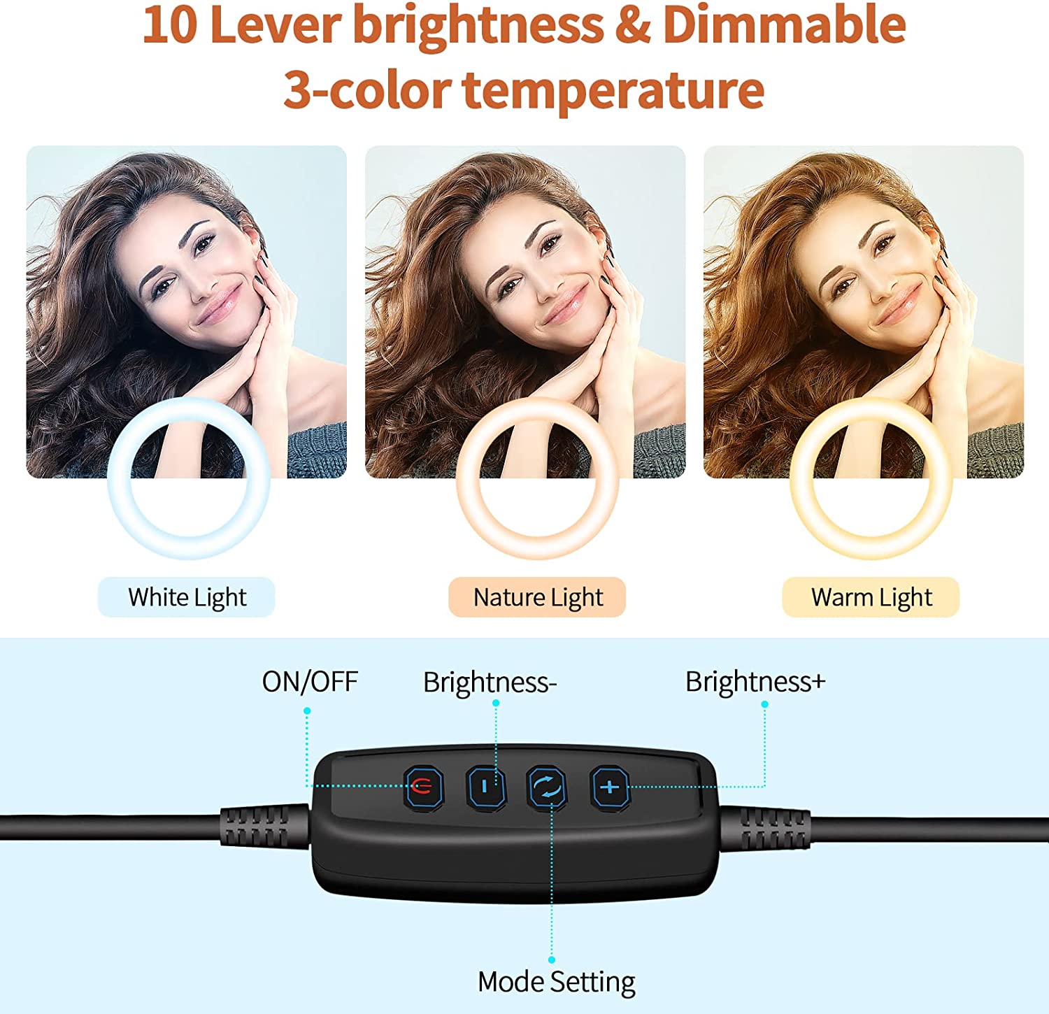 Dimmable Ring Light: Ubeesize 10" Ring Light Features 3 Light Colors (Warm, Cool White, Daylight) And 11 Levels Brightness In Each Color, 33 Options In Total. You Can Choose Any Option In Between If There’S A Perfect Setting. Adjustable & Stable Tripod : Extending From 15" To 50", And Tripod Legs Unfold Up To 30" Wide, The Stable Tripod Can Be Adjusted To Any Height Within As Needed, Short Enough To Stand On Tabletop, Tall Enough To Fit Your Height. Endless Lighting Angle: 3-Way Pan Head With A Convenient Handle Allows For Tilt And Swivel Motion; Portrait Or Landscape Options. Making It Easy To Target The Ring Light To Your Subject At Any Angle, Perfect For Live Streaming, Video Calling, Flat Lay, Taking Selfies Or More. Flexible Phone Holder From The Ring: Rather Than Placing The Cellphone Outside The Ring, Our Ring Light Is Big Enough That You Can Place Your Cellphone In The Ring To Make The Most Of This Circle Light. Bluetooth Remote And Lifetime Service: It Comes With A Bluetooth Remote, So You Don'T Even Need To Touch Your Cellphone To Start The Video Or Selfie. Ubeesize Provides 3-Years Replacement Service For Any Part In This Ring Light Stand Set (Ring Light, Tripod Stand, And Bluetooth Remote.).