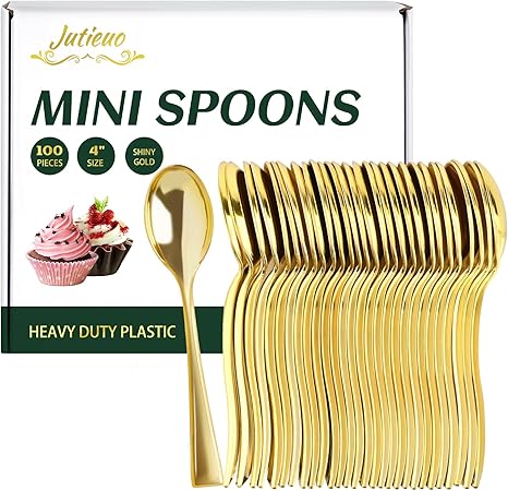 Gold Mini Spoons 4 Inch (100-Count) Disposable Small Plastic Dessert Spoons for Appetizers Tasting, Cocktail Hors D'oeuvres, Charcuterie Board, Wedding Reception