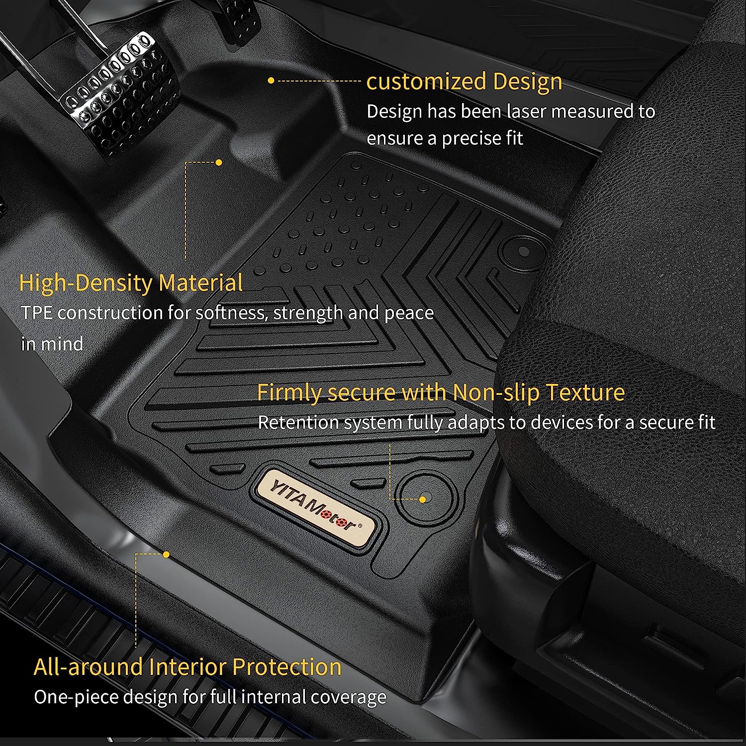 • SAFE & DURABLE: YITAMOTOR floor liners are made with non-toxic and odorless TPE material, ensuring 100% safety even in extreme hot weather. The product contains no latex, cadmium, lead, or any harmful PVC’s. High tensity TPE material not only provides a superb feel and extreme wear-resistance, but also remains flexible in even the harshest cold weather.