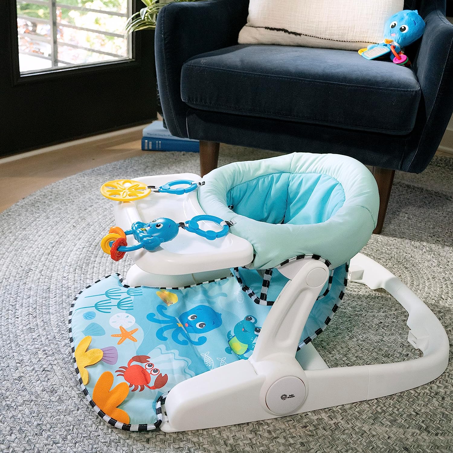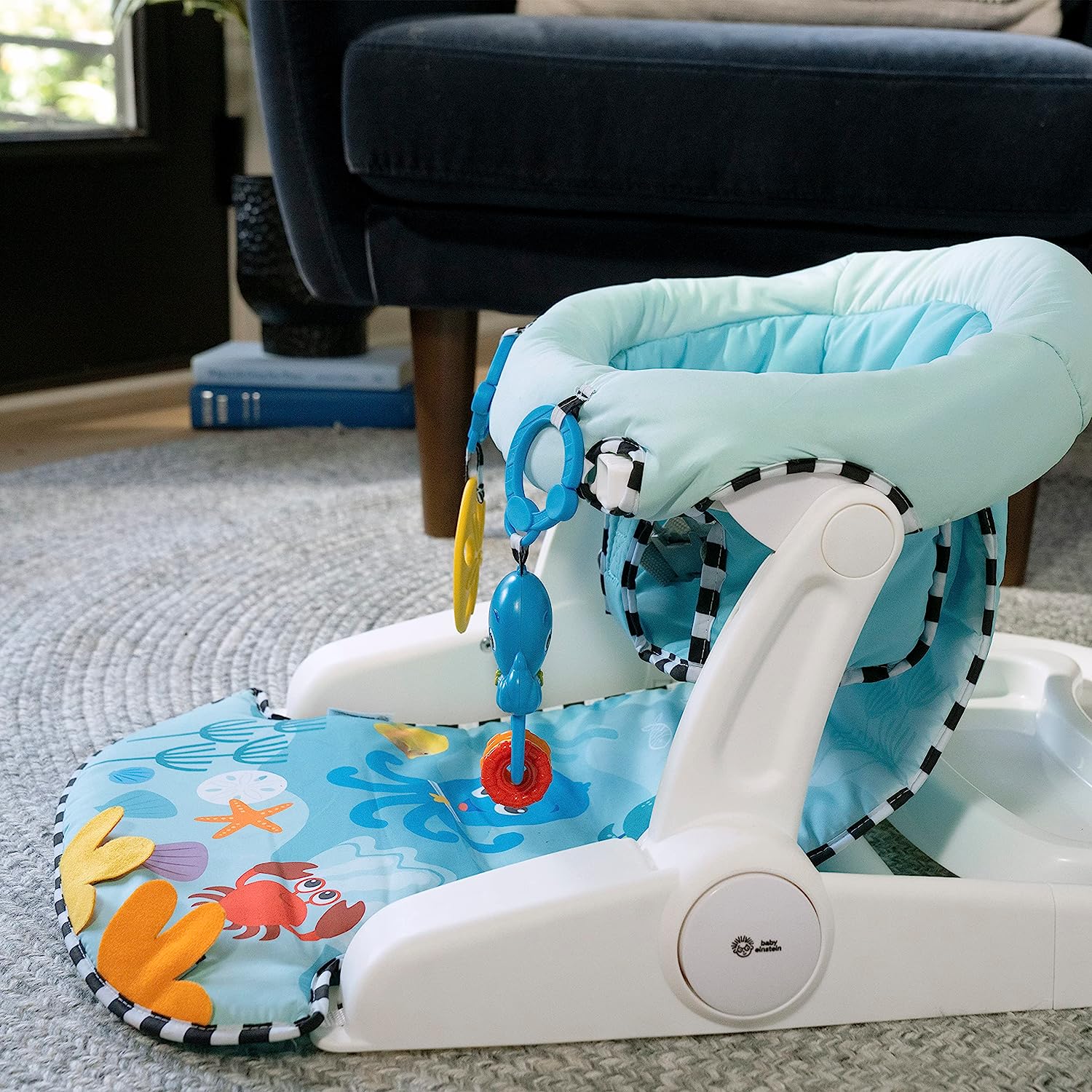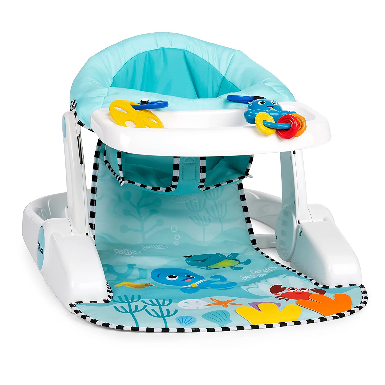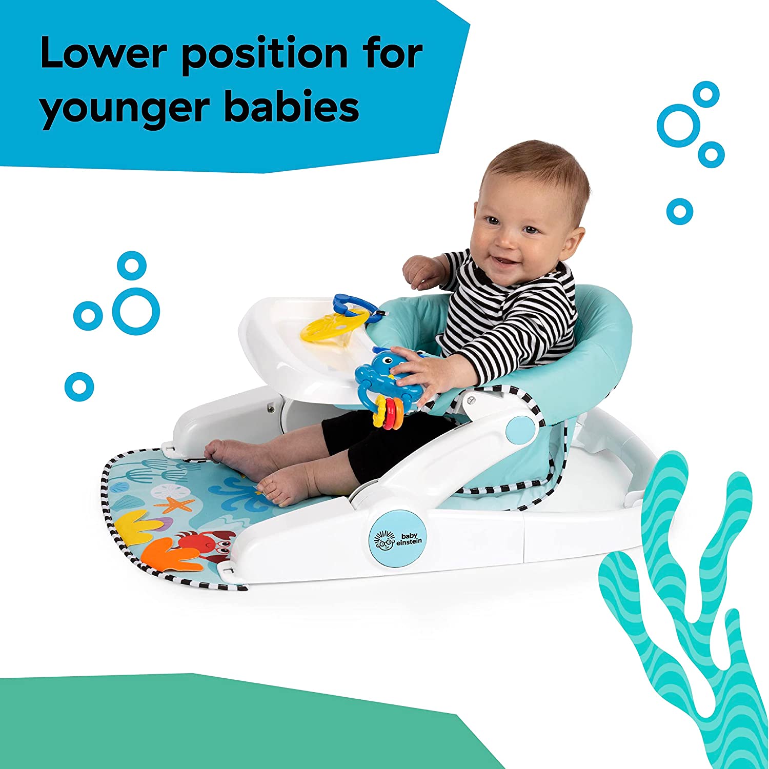 Support baby’s sitting skills with the Baby Einstein Sea of Support 2-in-1 Sit-Up Floor Seat. This Baby Einstein Ocean Explorers activity seat offers comfortable support as baby grows toward learning to sit up. With 2 seat height adjustments, 2 take-a-long sensory toys, and a unique textured mat, babies as young as 4 months can enjoy extra support as they explore during floor play, snack time, and beyond. Designed with baby’s comfort and growth in mind, the seat offers both a lower position for younger, smaller infants, and an upright position for older, larger babies. Soft, textured seat pad wipes clean. Two, linkable toys engage baby and detach for exploration on-the-go. Seat features a gender-neutral design, and folds flat for travel or storage. Dishwasher safe, BPA-free tray stores neatly under the seat. Appropriate for ages 4-12 months, and for children who can hold head up unassisted, but are not yet able to walk or climb.