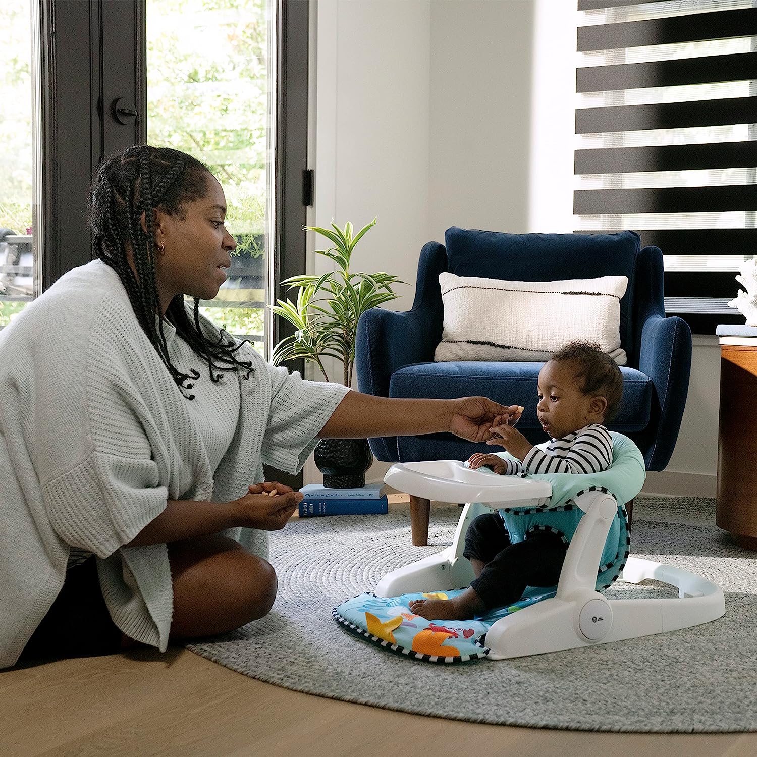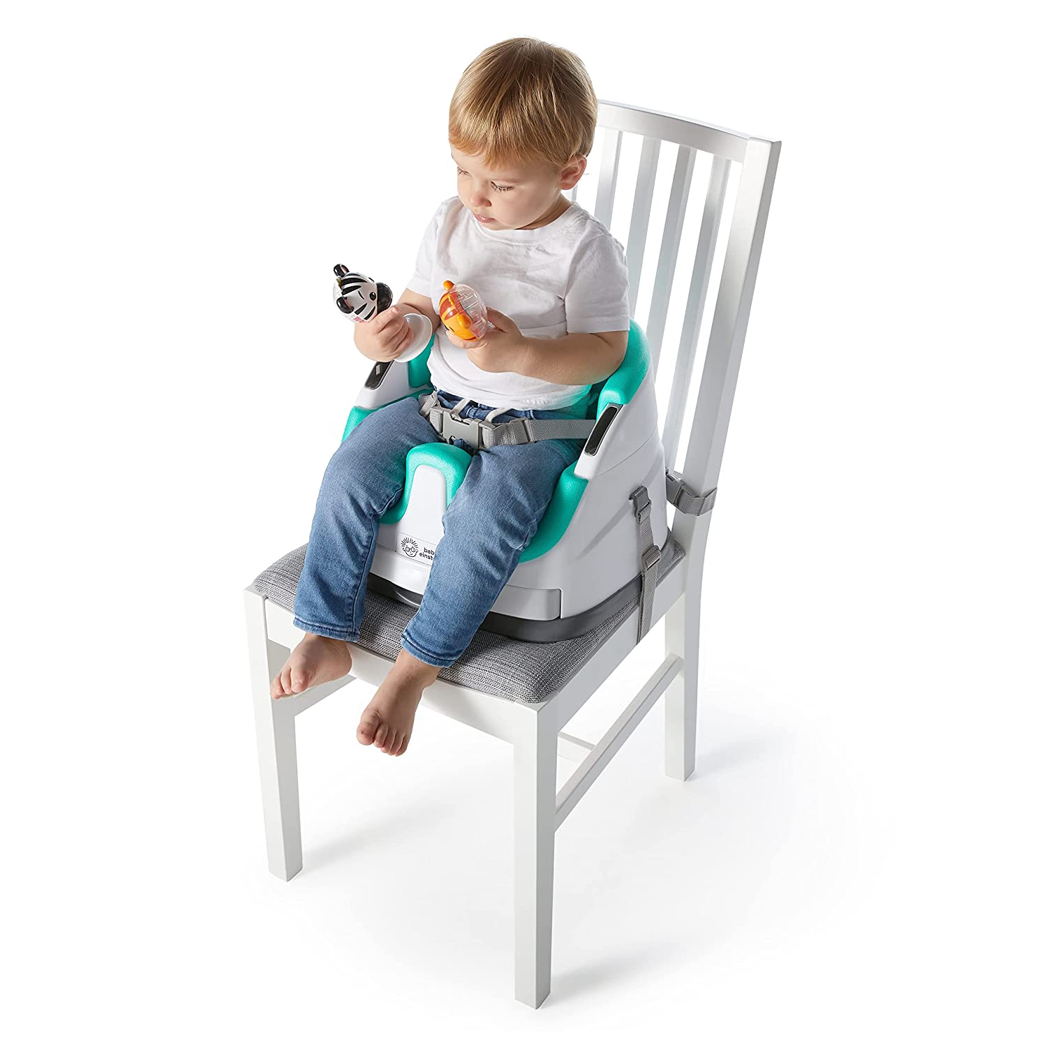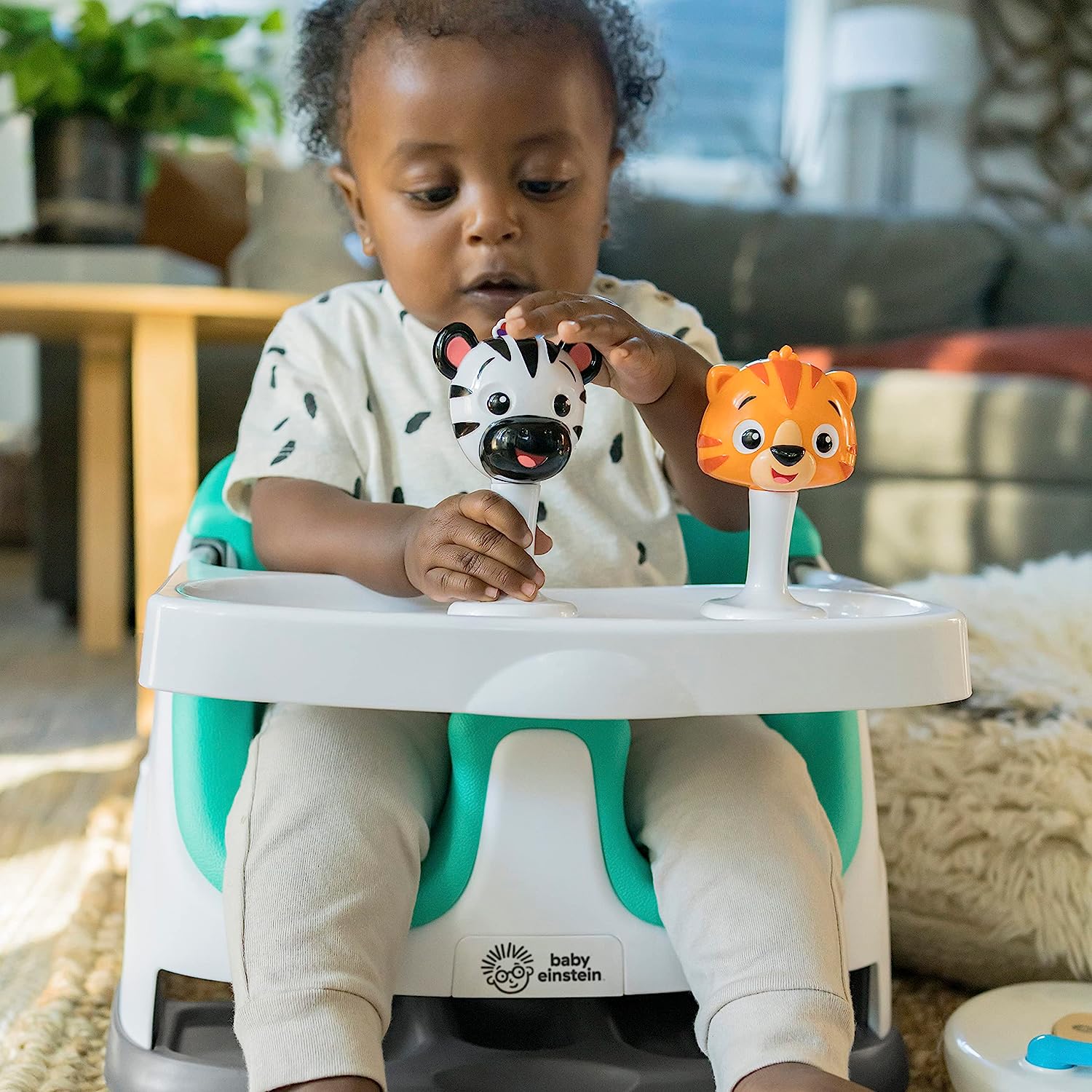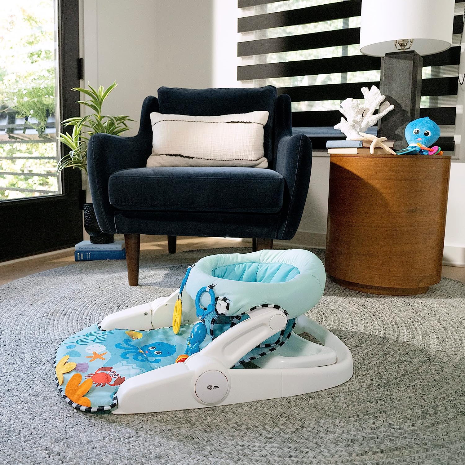 Support baby’s sitting skills with the Baby Einstein Sea of Support 2-in-1 Sit-Up Floor Seat. This Baby Einstein Ocean Explorers activity seat offers comfortable support as baby grows toward learning to sit up. With 2 seat height adjustments, 2 take-a-long sensory toys, and a unique textured mat, babies as young as 4 months can enjoy extra support as they explore during floor play, snack time, and beyond. Designed with baby’s comfort and growth in mind, the seat offers both a lower position for younger, smaller infants, and an upright position for older, larger babies. Soft, textured seat pad wipes clean. Two, linkable toys engage baby and detach for exploration on-the-go. Seat features a gender-neutral design, and folds flat for travel or storage. Dishwasher safe, BPA-free tray stores neatly under the seat. Appropriate for ages 4-12 months, and for children who can hold head up unassisted, but are not yet able to walk or climb.