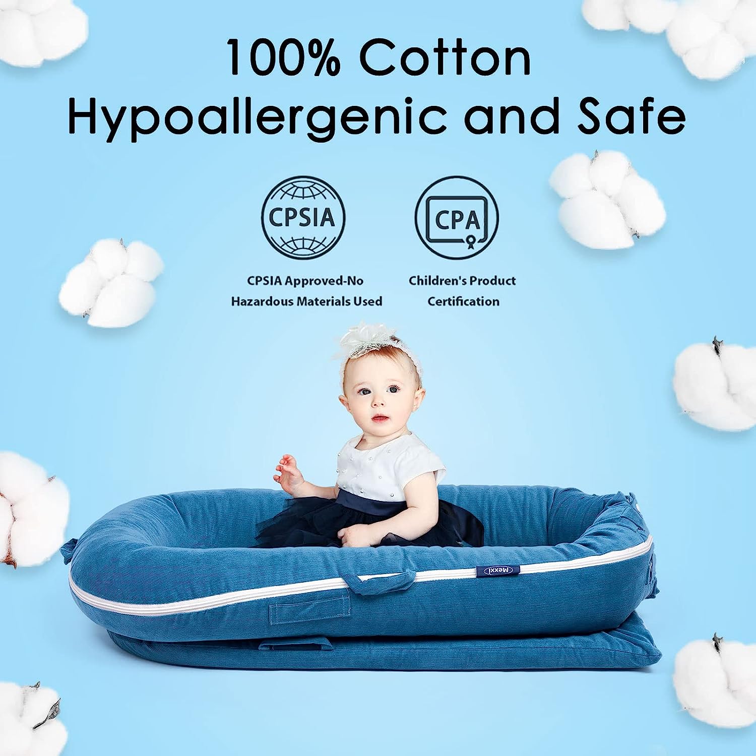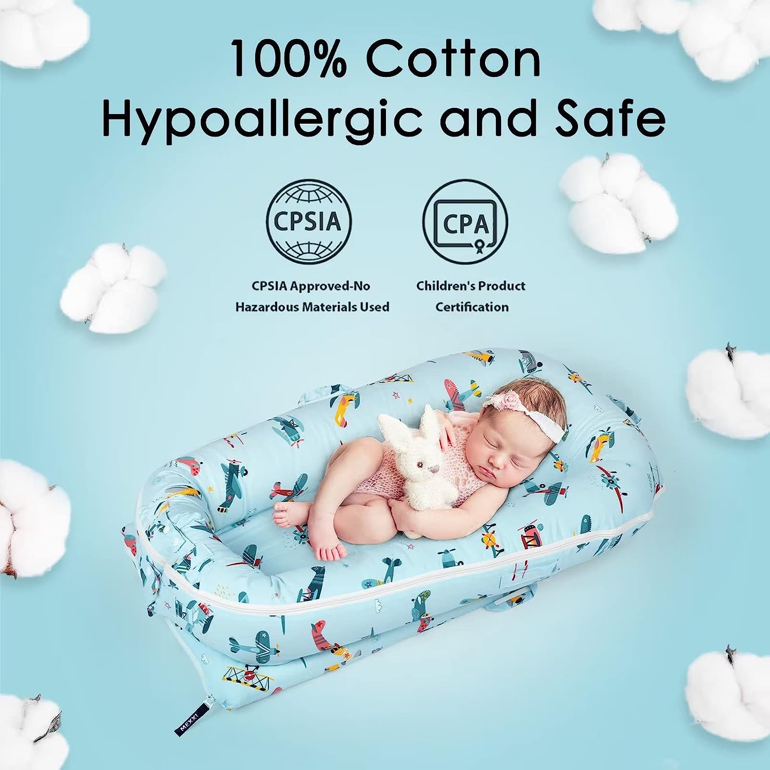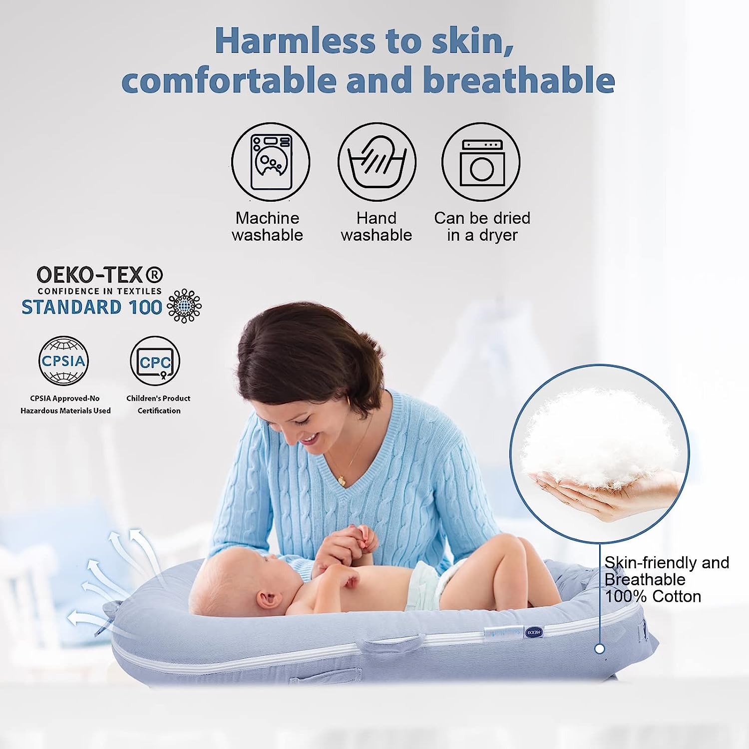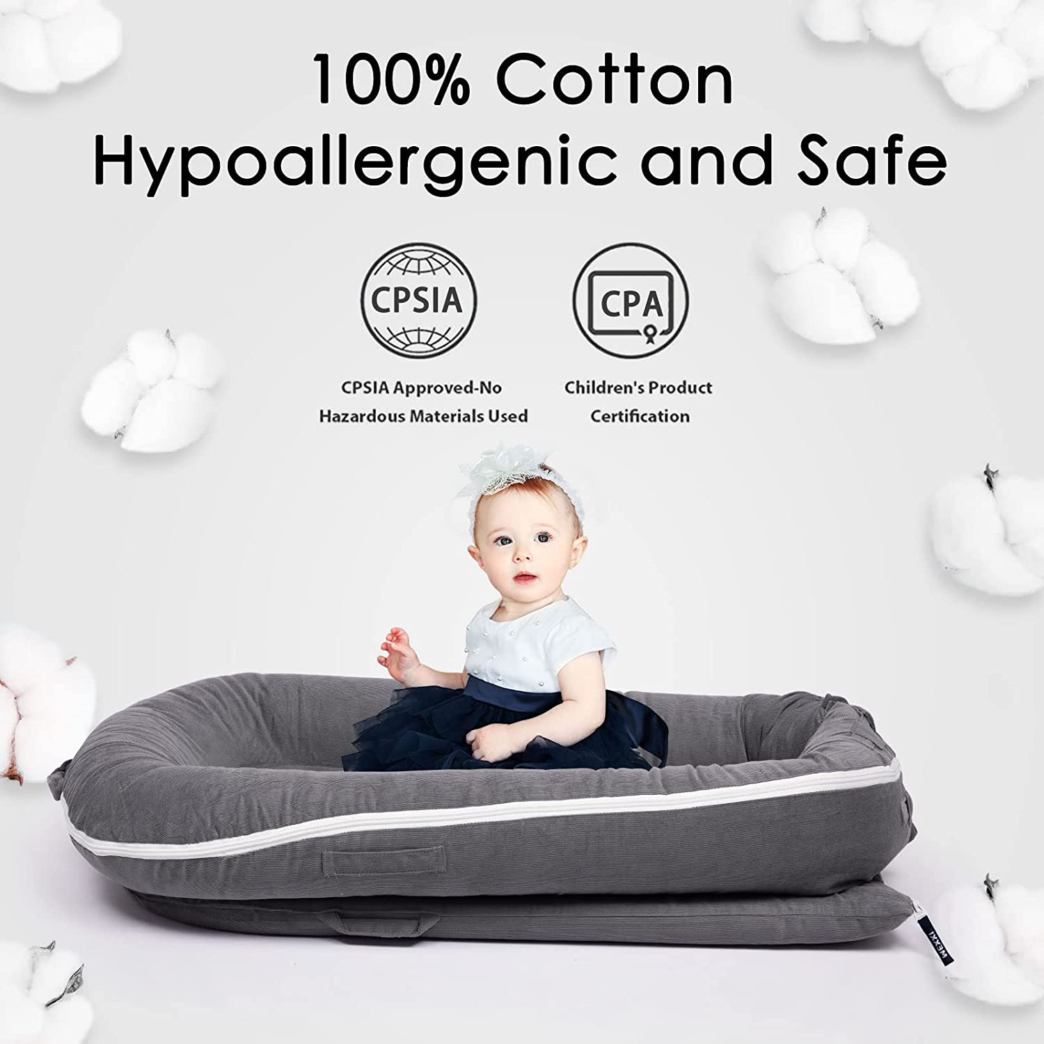 Having a couple of extra covers for your deluxe dock is a life saver. Our baby lounger cover perfectly fits your dock. Having handles on the sides makes it easy to carry the dock with you while you travel. 100% cotton and non-toxic fabric is used in the manufacturing process of our replacement covers. You do not have to worry about your child being exposed to harmful substances. Strong zippers and snap buttons will last for years to come.