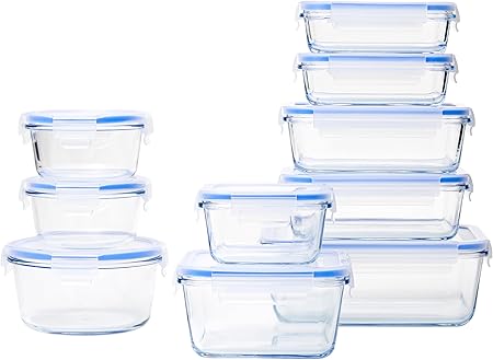 Amazon Basics 20-Piece Glass Food Storage Containers, 10 Count of Bases and Plastic Lids, Transparent, Blue