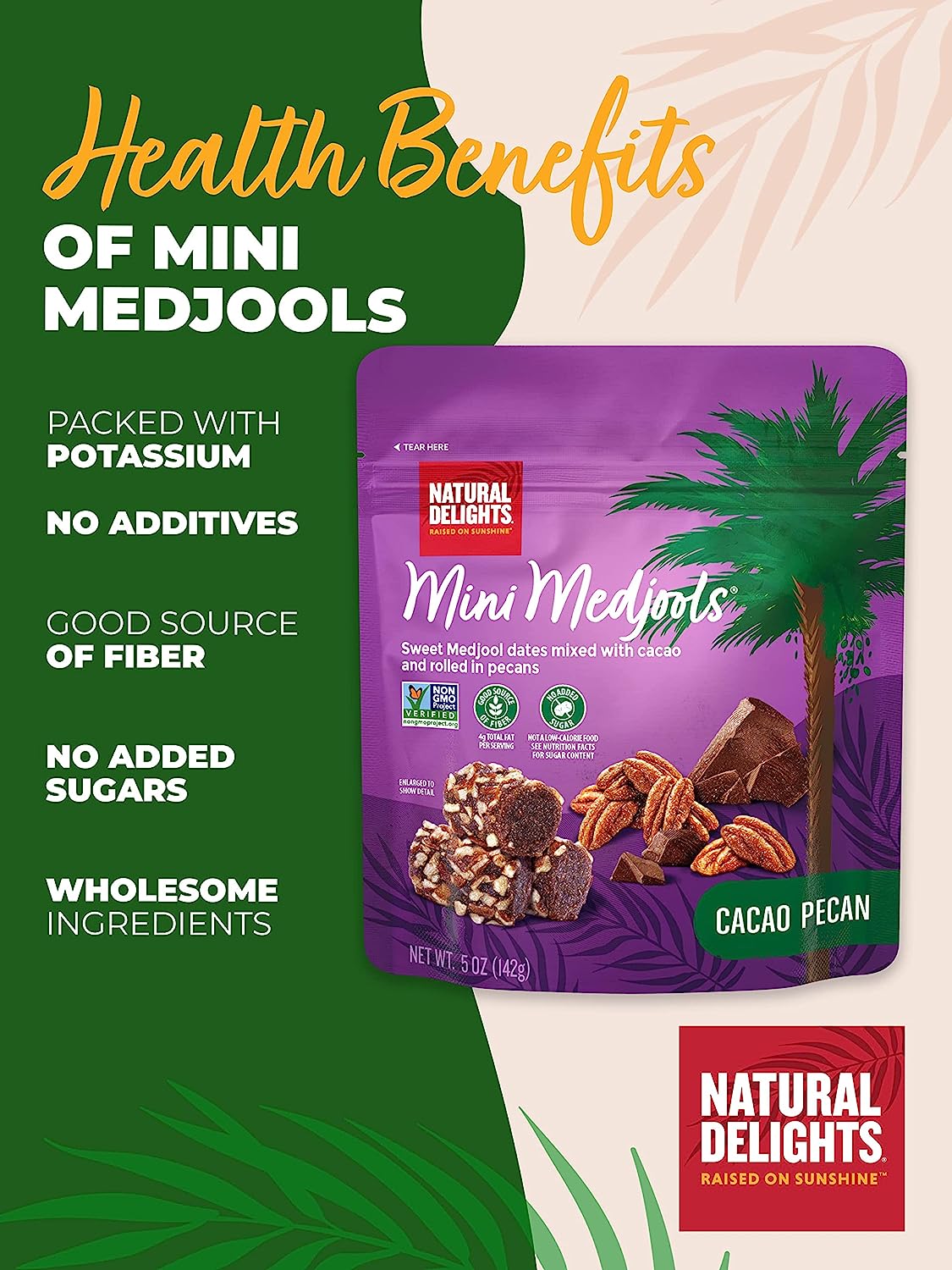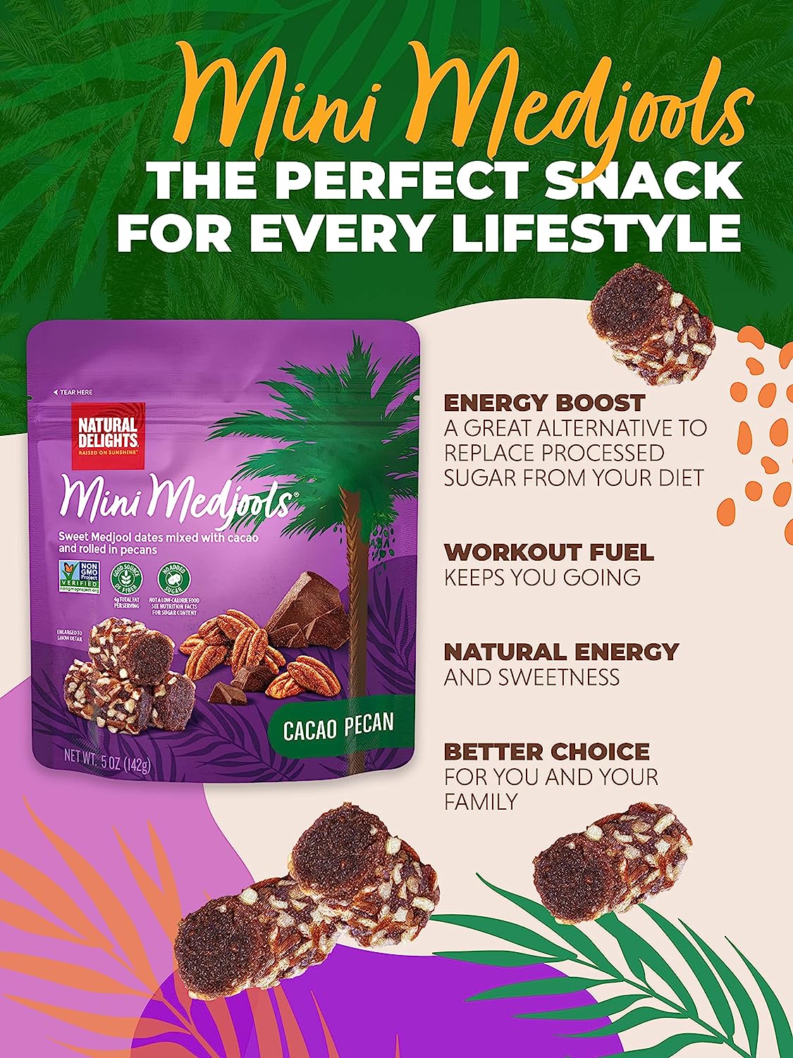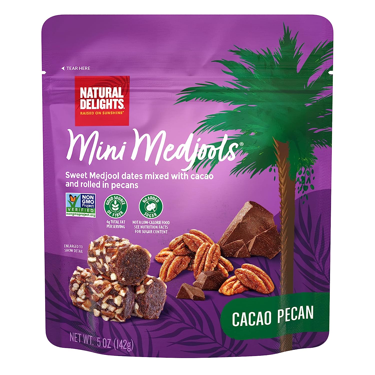 Natural Delights Cacao Pecan Mini Medjools Pouch (5 oz) | Great Snacks for Adults and Kids | Non-GMO Verified | On the Go Snack