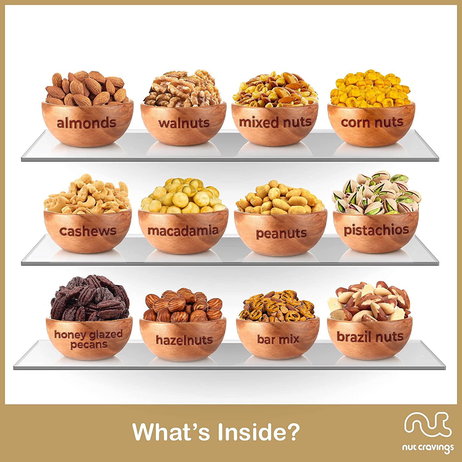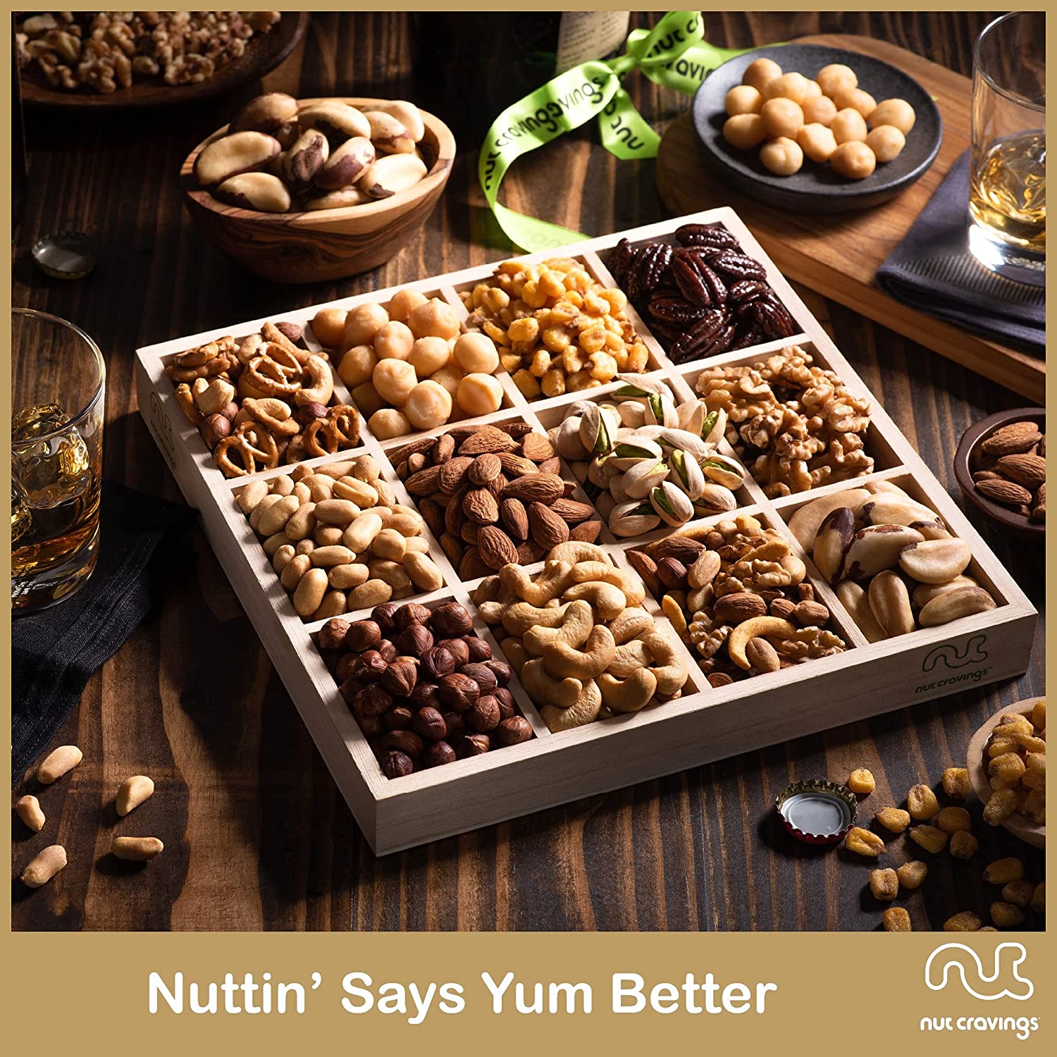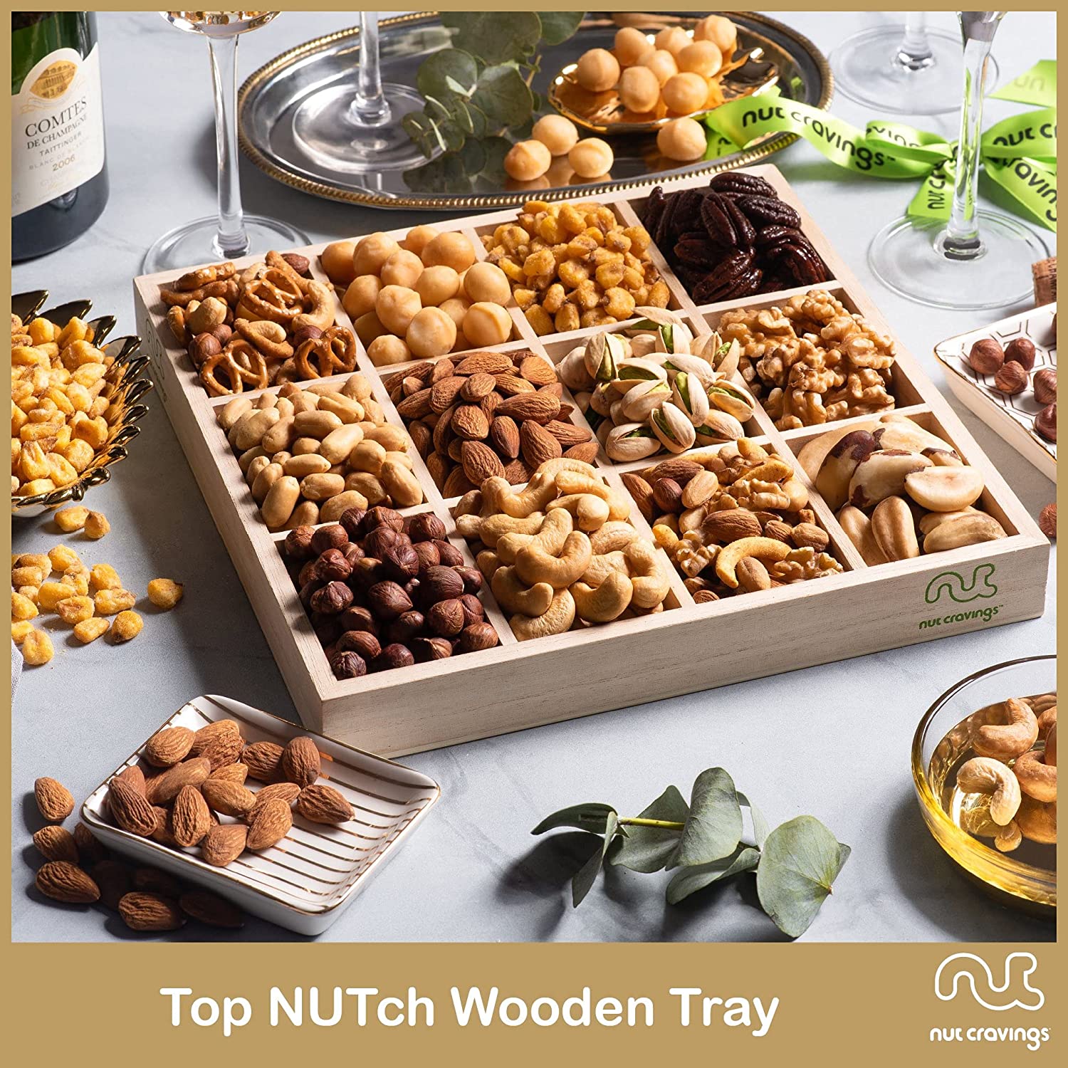 Nut Cravings Gourmet Collection - Mixed Nuts Gift Basket in Reusable Wooden Tray + Green Ribbon (12 Assortments) Food Bouquet Platter, Bday Care Package Healthy Kosher Snack Box, Women Men