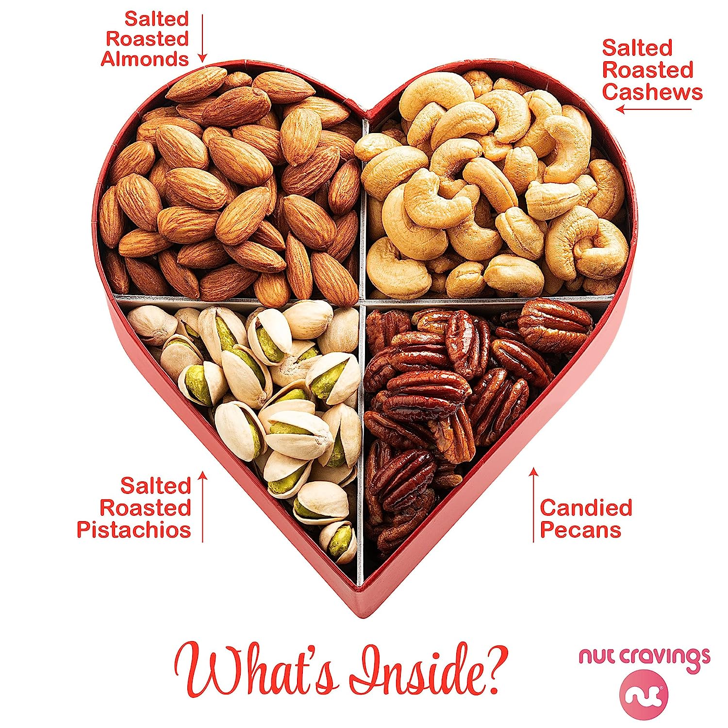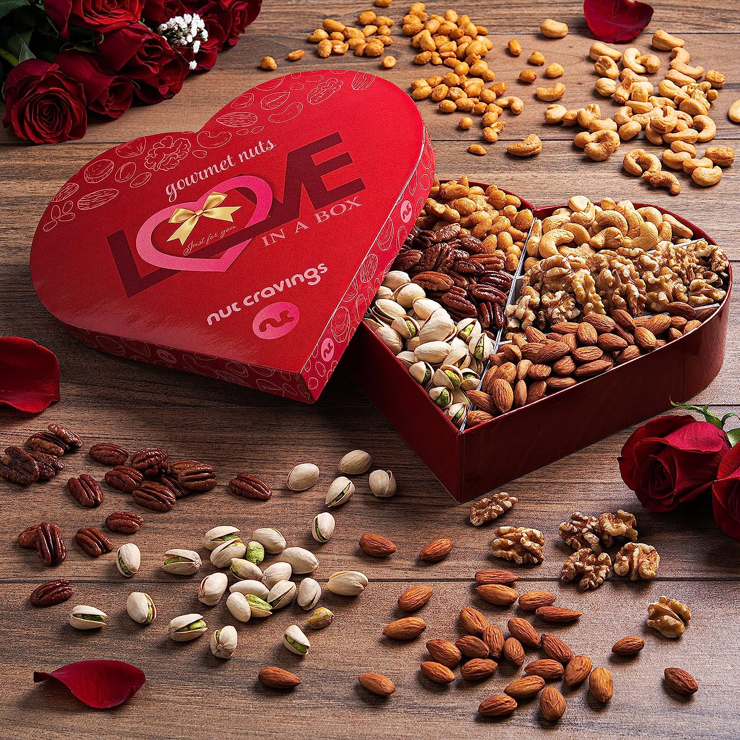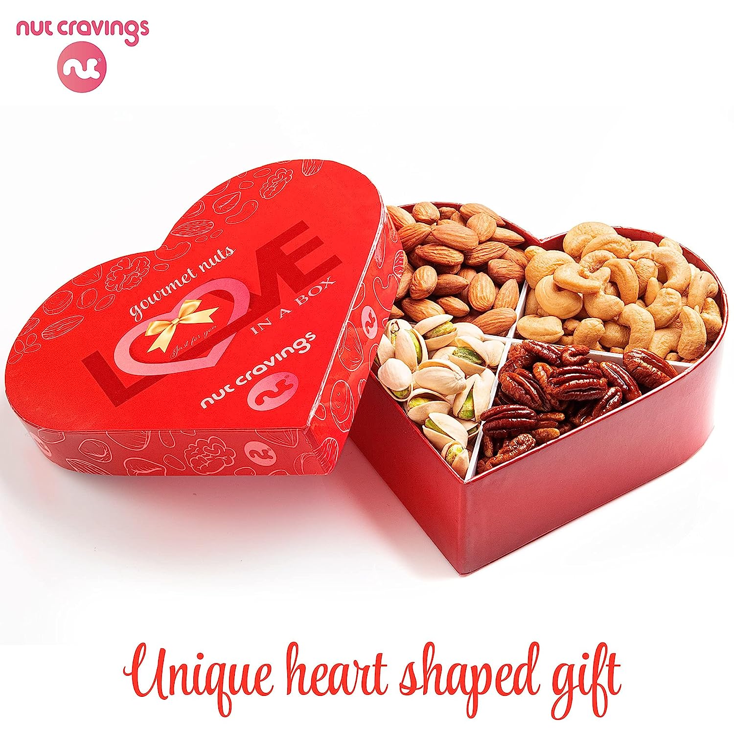 • 🥜 A SELECTION OF 6 OF OUR BEST NUTS: Our Heart Shaped Nut Gift Basket includes a handful of 6 of our signature nuts: Pistachios, Almonds, Pecans, Cashews, Salted Peanuts, and Walnuts.