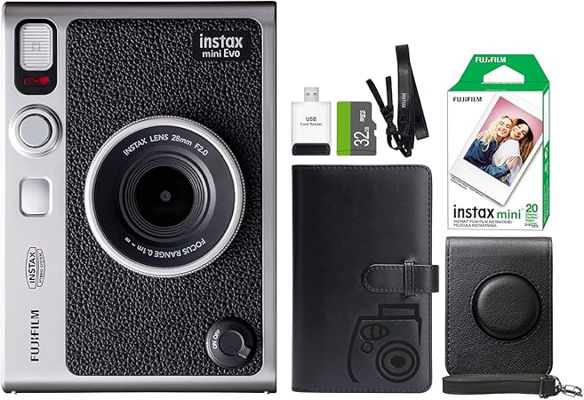 FUJIFILM INSTAX Mini EVO Hybrid Instant Camera Black + Fuji Instax Film 20 Sheet + Custom Case & Album 32GB Micro SD Memory Card Accessory Bundle