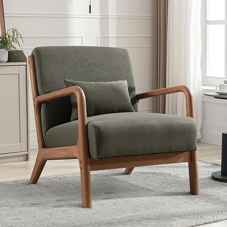 ANJ Modern Arm Chair, Mid-Century Modern Accent Chair Upholstered Lounge Chair with Pillow and Solid Wood Frame, Linen Fabric Comfy Chairs for Living Room