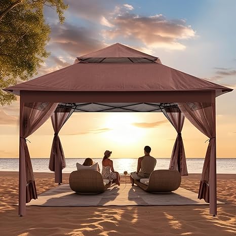 yoyomax 13X13 Outdoor Pop Up Gazebo with Netting, Portable Gazebo Waterproof Patio Canopy Shelter with Double Roof Tops and 169 Square Feet of Shade for Beach Parties, Camping and Picnics - Brown