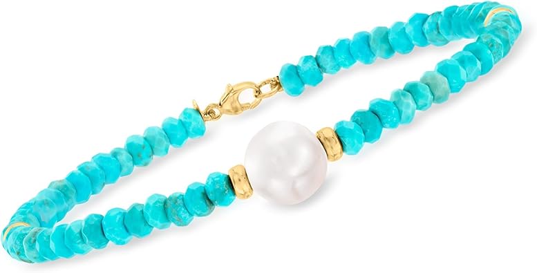 Ross-Simons 9-10mm Cultured Pearl and Turquoise Bead Bracelet in 14kt Yellow Gold