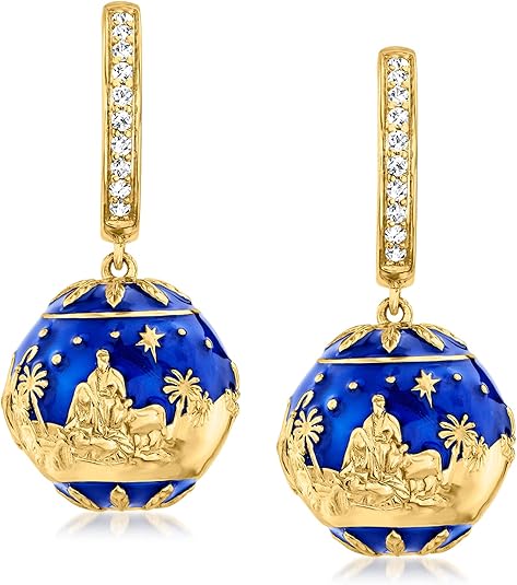 Ross-Simons 0.30 ct. t.w. White Topaz and Blue Enamel Nativity Hoop Drop Earrings in 18kt Gold Over Sterling