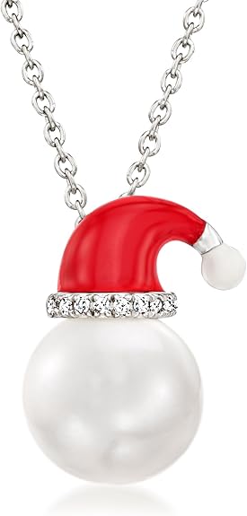 Ross-Simons 9-9.5mm Cultured Pearl and Multicolored Enamel Santa Hat Pendant Necklace With Diamond Accents in Sterling Silver. 18 inches