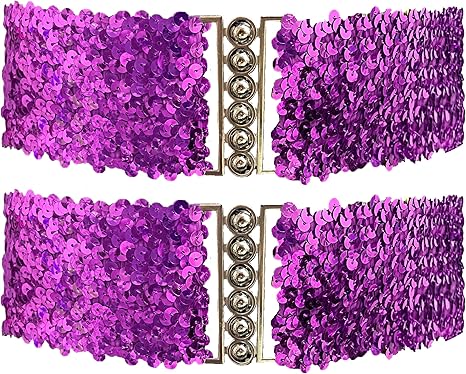 2 Pack Girls Sequin Sparkly Metal Interlooking Buckles Elastic Waist Belt, Glitter Stretchy Belt for Women