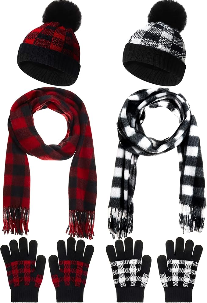 6 Pcs Buffalo Plaid Winter Warm Sets for Kids 2 Pcs Knitted Pom Beanie Hat