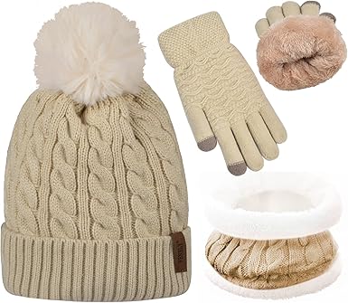 3Pcs Winter Women Beanie Hat Scarf and Touch Screen Gloves Sets Girls Classic Knit Warm Chunky Fleece Lined Cable Cap