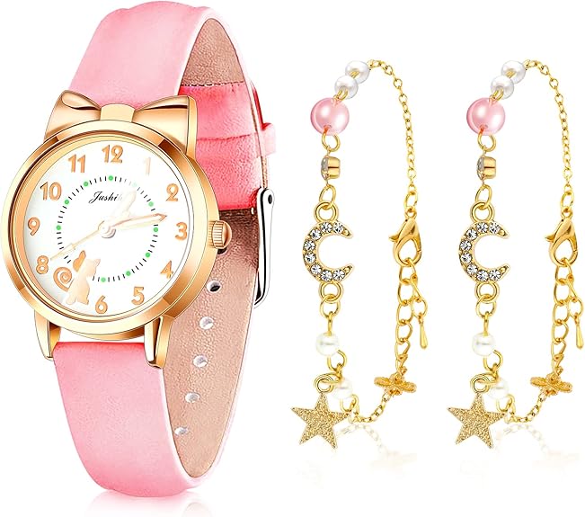 Hicarer 3 Pieces Kids Watch and Star Bracelet Children Quartz Watches, Including Cute Cat Pattern Watches Leather Quartz Watches 2 Pcs Beaded Chain Bracelets for Children's Day Graduation(Pink)