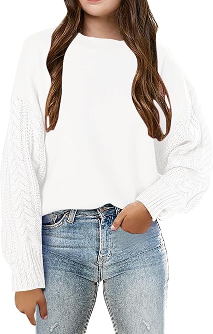 Haloumoning Girl's Crew Neck Sweaters Kids Long Sleeve Drop Shoulder Pullover Cable Knit Chunky Contrast Sweater Tops