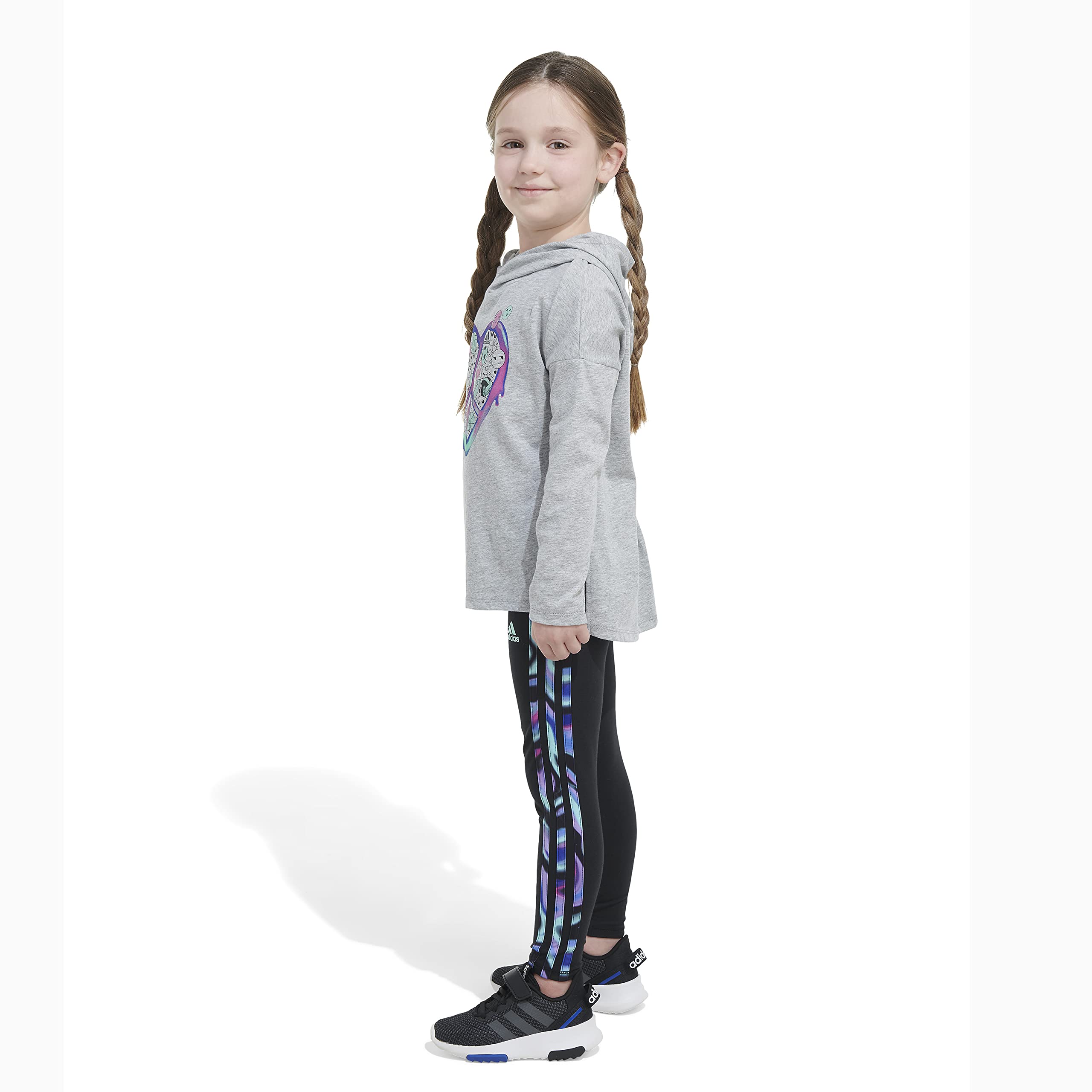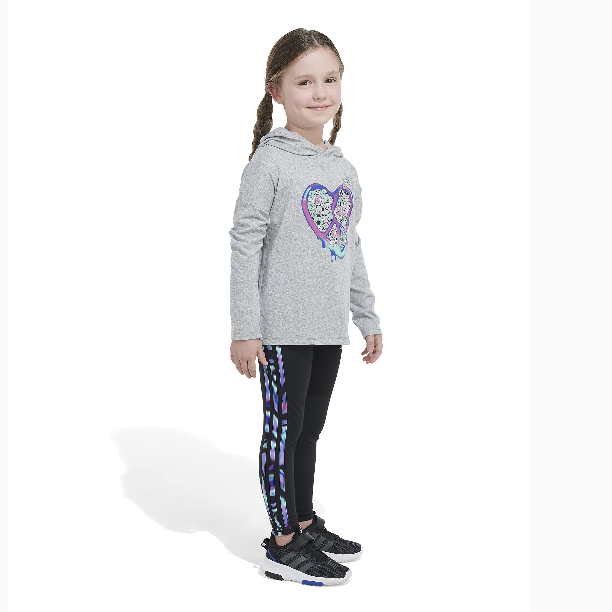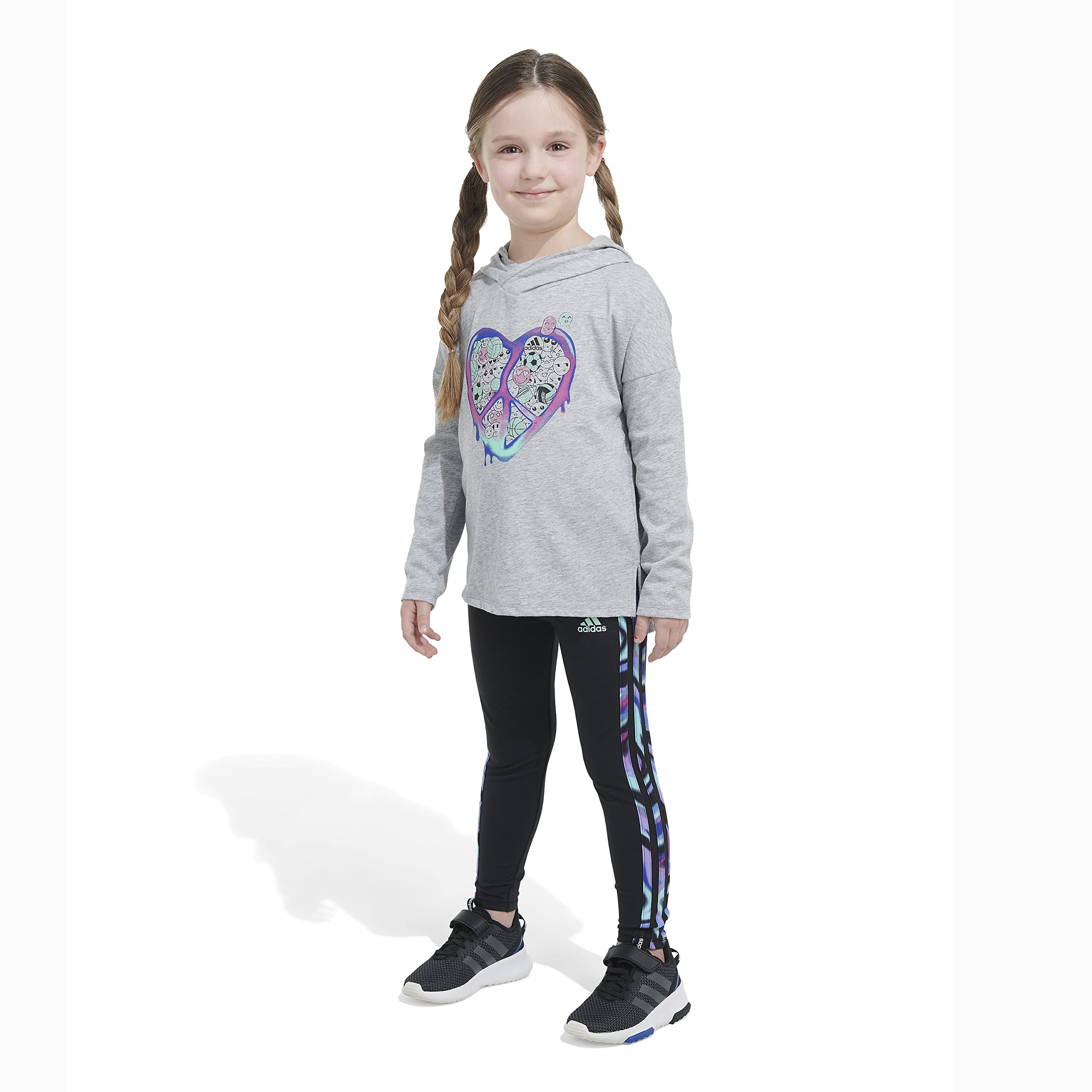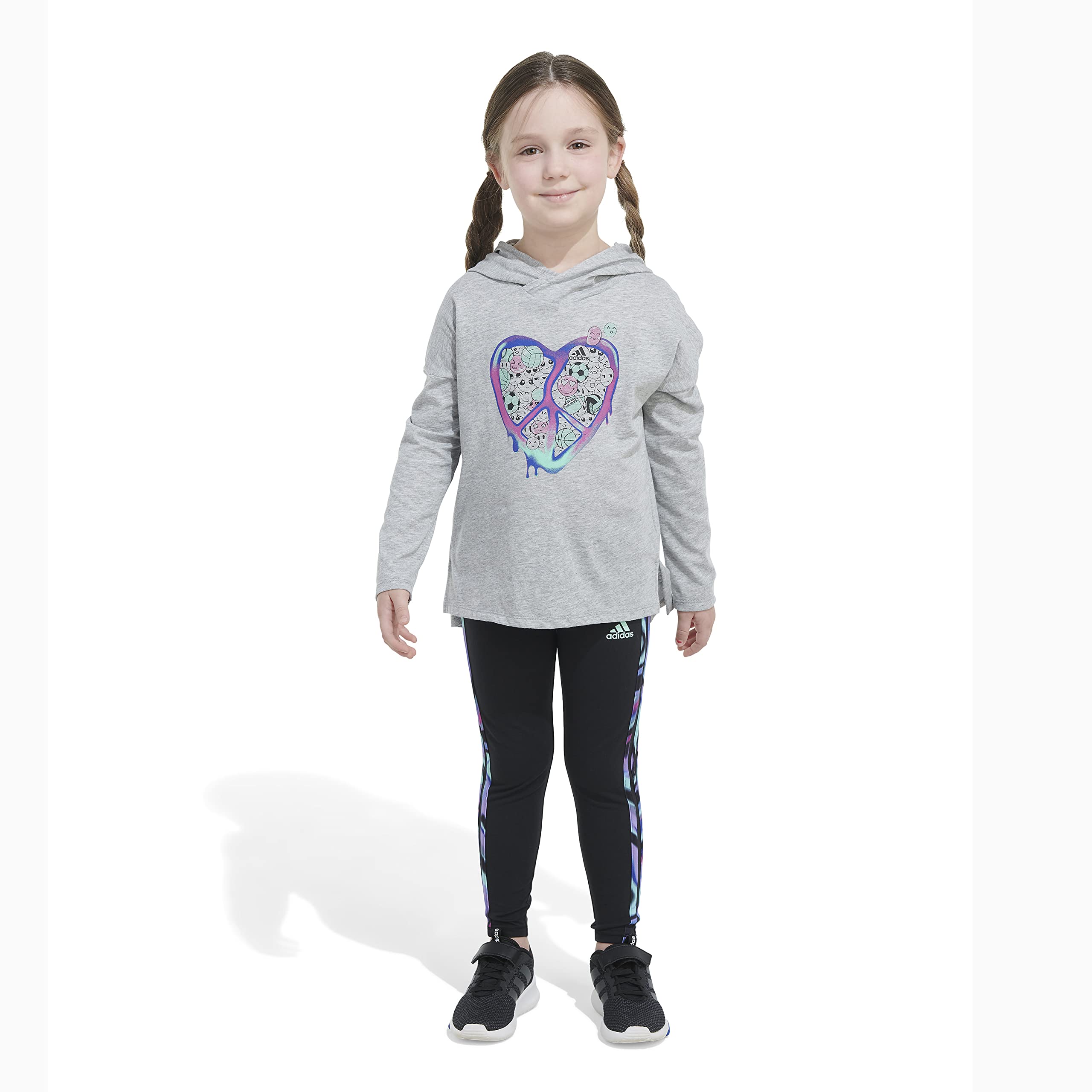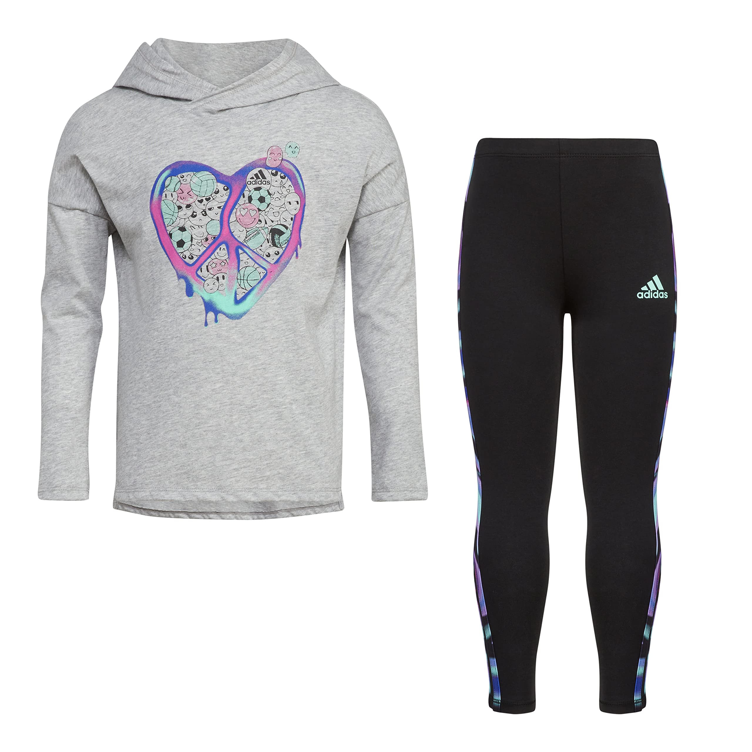 Details: Bold color and vivid graphics make this girls' outfit complete. An emoji heart design adds a playful touch to the hoodie tee. The adidas 3-Stripes get a bump of gradient color to finish strong. Soft and comfortable, this set is ready for action.