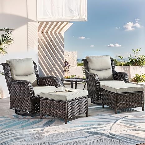 Patio Conversation Set with Smile-Shaped Cushions, Luxury Outdoor Swivel Chairs with Side Table and Ottomans, 5PCS PE Rattan Swivel Glider Chairs Set, Brown Wicker|Beige Cushions