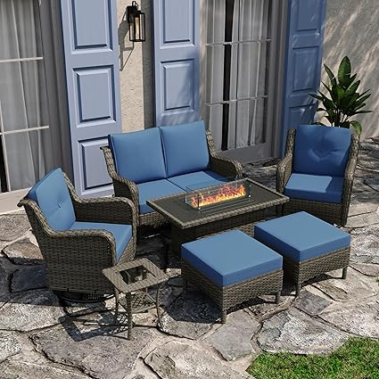 UIXE 8 Piece Patio Furniture Set with Fire Pit Table, Outdoor Swivel Rocking Glider Chairs w/Ottomans, Wicker Sectional Sofa Swivel Glider Chair Conversation Sets with Firepit and Side Table - Blue