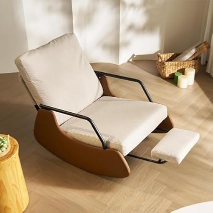 Rocking Recliner Chair for Adults, Upholstered Plush Seating Glider Rocker with High Backrest, Reading Chair Modern Nursery Accent Sofa Chairs Glider for Living Room (White/Brown)