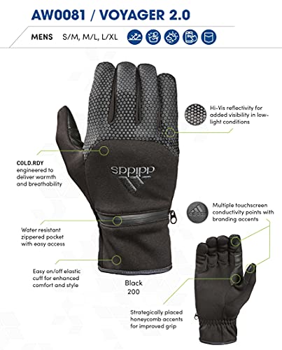 Details: The adidas winter performance Voyager 2.0 running glove is a transition glove that covers all your daily needs with style and function! The Voyager 2.0 transitions from your everyday life to outdoor activity without missing a beat. With E-TIP design functionality, users can interact with technology and their compatible devices. The All-Weather design operates in any type of weather condition and reflective technology illuminates in oncoming lights, bringing greater visibility and awareness to others for your added safety. Also, easy to care for and clean - just hand wash and air dry. The gloves feature a hidden pocket compartment within the glove to hold small items. The COLD.RDY insulating technology keeps you feeling warm and confident. Insulated fabrics, wind resistance, and water repelling characteristics make the COLD.RDY series a winter staple.