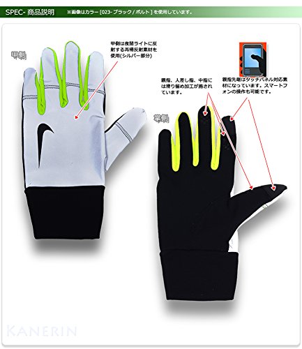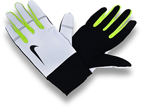 Details: Designed with reflective detailing, the Nike Vapor Flash Running Gloves ensure visibility is catered for in low light settings. Constructed with Nike Shield fabric, an accumulation of weather protecting solutions are combined; repelling water, blocking wind and keeping hands warm are no mean feat for the Vapor Flash Running Gloves. Anatomically designed through the integration of knuckle and finger gussets, Nike Dri-FIT fabric interwoven within the glove, wicks sweat away, leaving you comfortable and dry. Conductive thumb and forefinger tips have been introduced, accounting for the use of your touchscreen device. Ensuring your touchscreen device doesn't slip in the hand, strategically placed silicone dots offer enhanced grip in the hand. Completing the gloves in Nike fashion the swoosh logo grants the Vapour Flash a traditional aesthetic finish, with the additional benefit of incorporating reflective elements within its design; increased # visibility and safety in low level lighting conditions is attained.