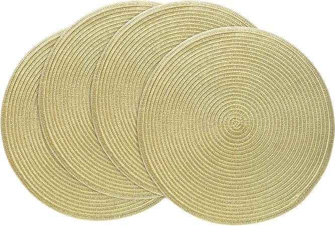 Floroom 15 Inch Round Braided Placemats Set of 4, Washable Heat Resistant Cotton Polyester Circle Place Mats for Kitchen Dining Table - Shimmer Gold