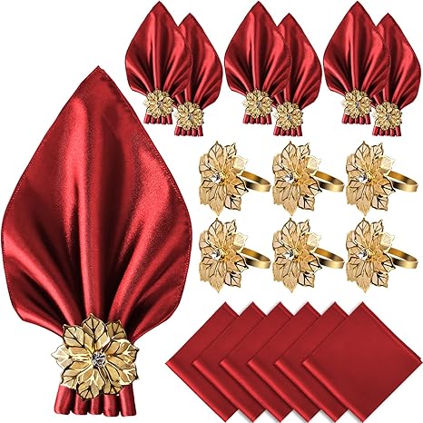 VIJIV 12 Pack Cloth Napkins and Gold Napkin Rings Set of 6, 17x17 Square Satin Dinner Table Napkins Rings Flower Personalized Napkins Bridal Shower Napkins for Wedding Reception Party Decorative