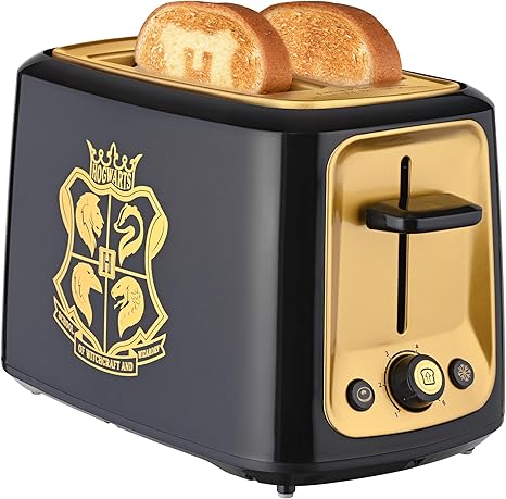 Warner Brothers Harry Potter 2-Slice Toaster by Select Brands, Imprints Hogwarts Crest and Harry Potter Glasses on Toasted Bread, Black and Gold, WBH-26TS