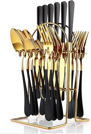 24 Pieces Flatware Set, Caliamary Stainless Steel Flatware Set with Silverware Holder Spoons Forks Knives, Utensils Set Service for 6, Gold Mirror Polished and Matte Pink Painted (Black)Š—_