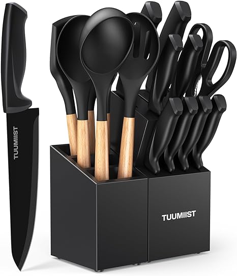 32-Piece Knife Set with Block, Sharpener, Silverware Set, and Removable Magnetic Utensil Holder (Black) - Precision Cutting and Organized Dining: Complete Kitchen Solution