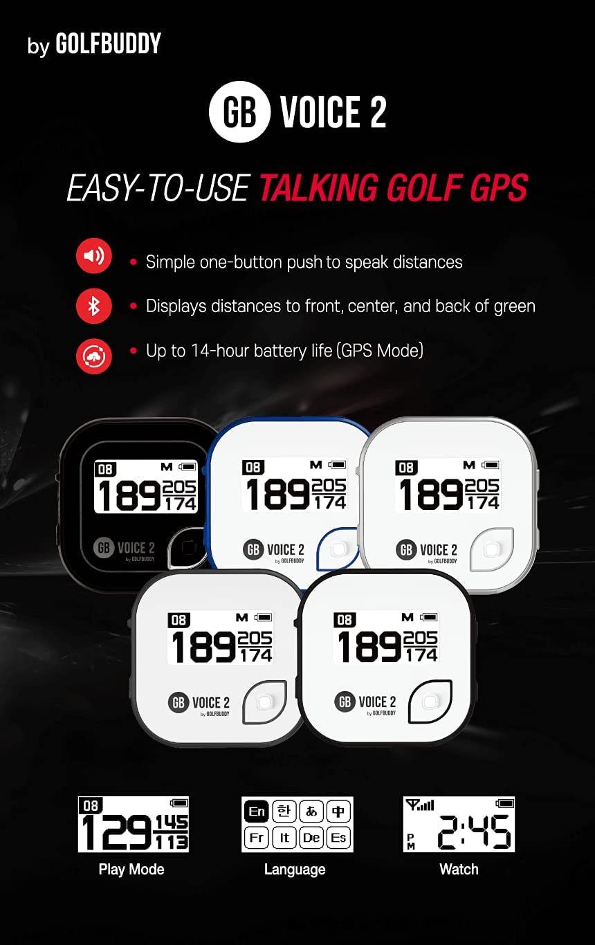• [Voice 2 SE+] The easy-to-use GOLFBUDDY Voice 2 SE+ is a talking GPS device that reads your distances allowed to the front, center, back of the green with the push of a button. It comes with an on/off slope feature that provides slope-adjusted distances for various elevations for more accuracy.