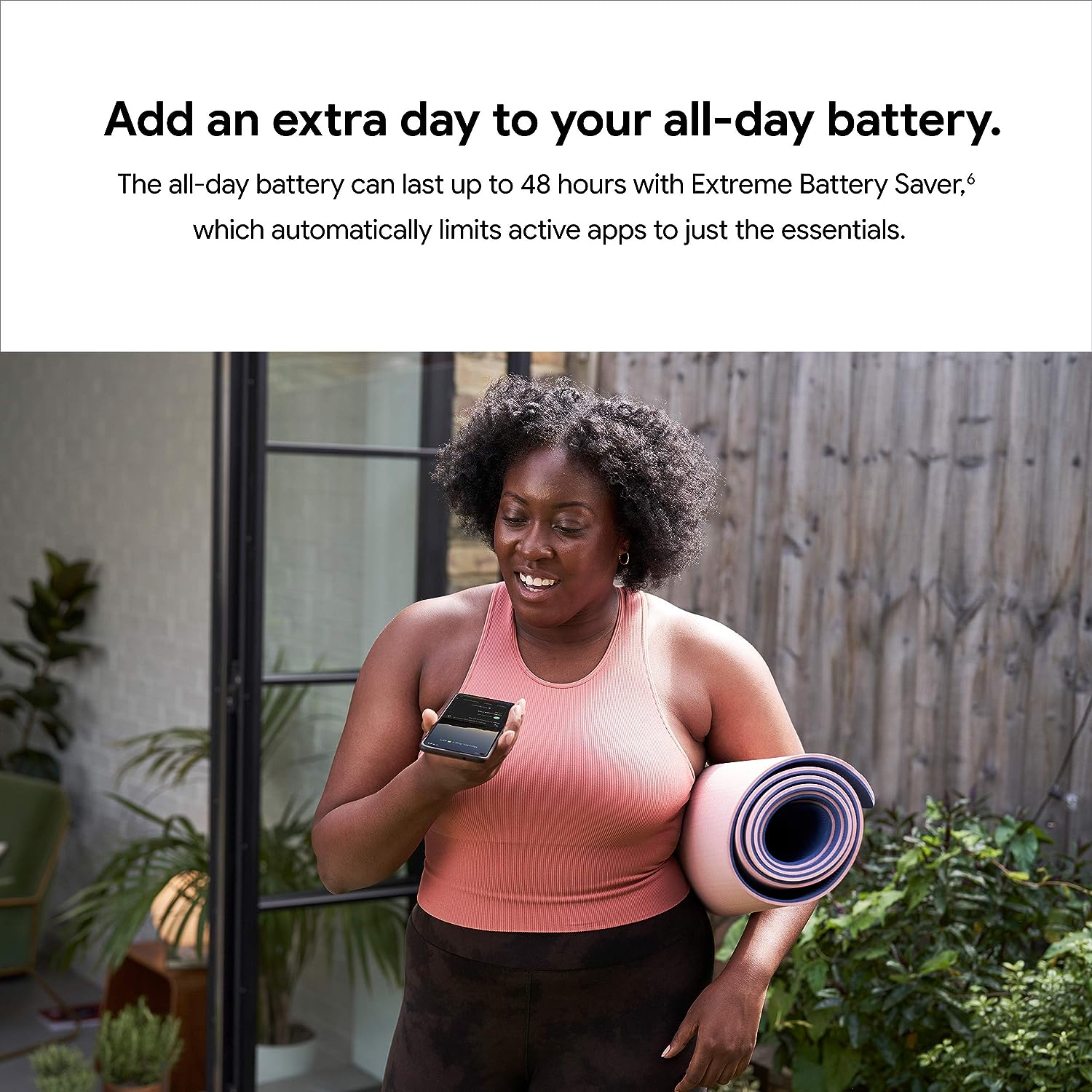 [6] For “All day”: Maximum battery life based on testing using a mix of talk, data, standby, and use of other features. Testing conducted on two major carrier networks using Sub-6 GHz non-standalone 5G (ENDC) connectivity. For “Up to 48 hours”: Maximum battery life based on testing using a mix of talk, data, standby, and use of limited other features that are default in Extreme Battery Saver mode (which disables various features including 5G connectivity). Testing conducted on two major carrier networks. For both claims: Pixel 4a (5G) and Pixel 5 battery testing conducted by a third party in California in mid 2020 on pre-production hardware and software using default settings, except that, for the “up to 48 hour claim” only, Extreme Battery Saver mode was enabled. Battery life depends upon many factors and usage of certain features will decrease battery life. Actual battery life may be lower.