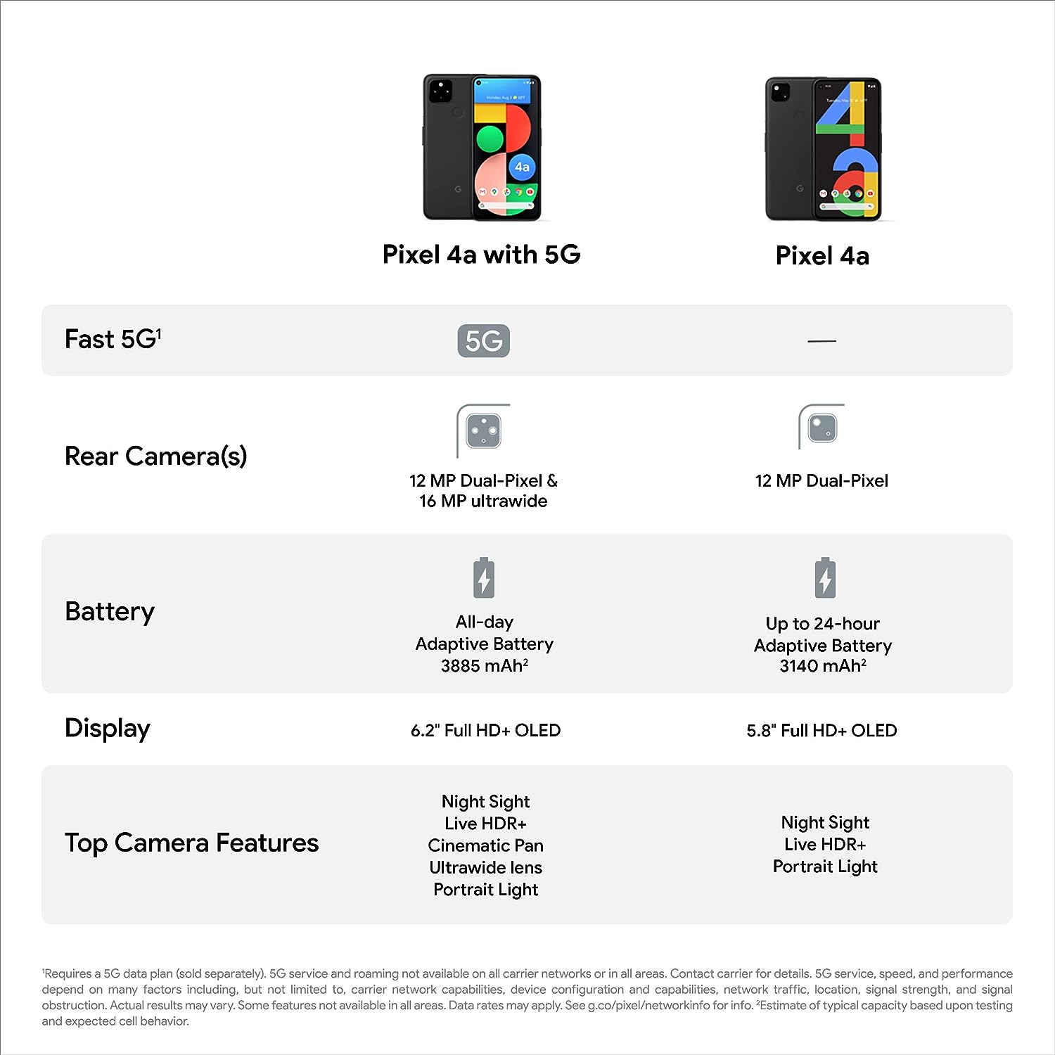 [12] Compared to MSRP of unlocked Pixel 5 phone on the Google Store in the US. Requires a 5G data plan (sold separately). 5G service and roaming not available on all carrier networks or in all areas. Contact carrier for details about current 5G network performance, compatibility, and availability. Phone connects to 5G networks, but 5G service, speed, and performance depend on many factors including, but not limited to, carrier network capabilities, device configuration and capabilities, network traffic, location, signal strength, and signal obstruction. Actual results may vary. Some features not available in all areas. Data rates may apply.[13] Not available for all apps and content. Display automatically adjusts to optimize for best viewing and battery performance.